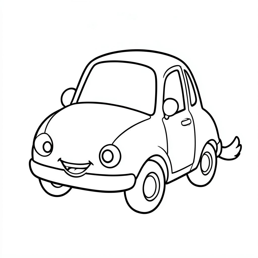: Màu sắc Mô tả: Một chiếc xe nhỏ, tròn với nụ cười rạng rỡ, thân thiện. Nó hơi mũm mĩm, với các cạnh mềm, tròn. Những đường nét dày, hạnh phúc phác thảo thân xe. Đầu xe nhỏ và vui vẻ, đuôi dài và vẫy vẫy. Đó là một chiếc xe đơn giản, đáng yêu - chỉ có chính chiếc xe!, tô màu, nghệ thuật đường nét, nền trắng
