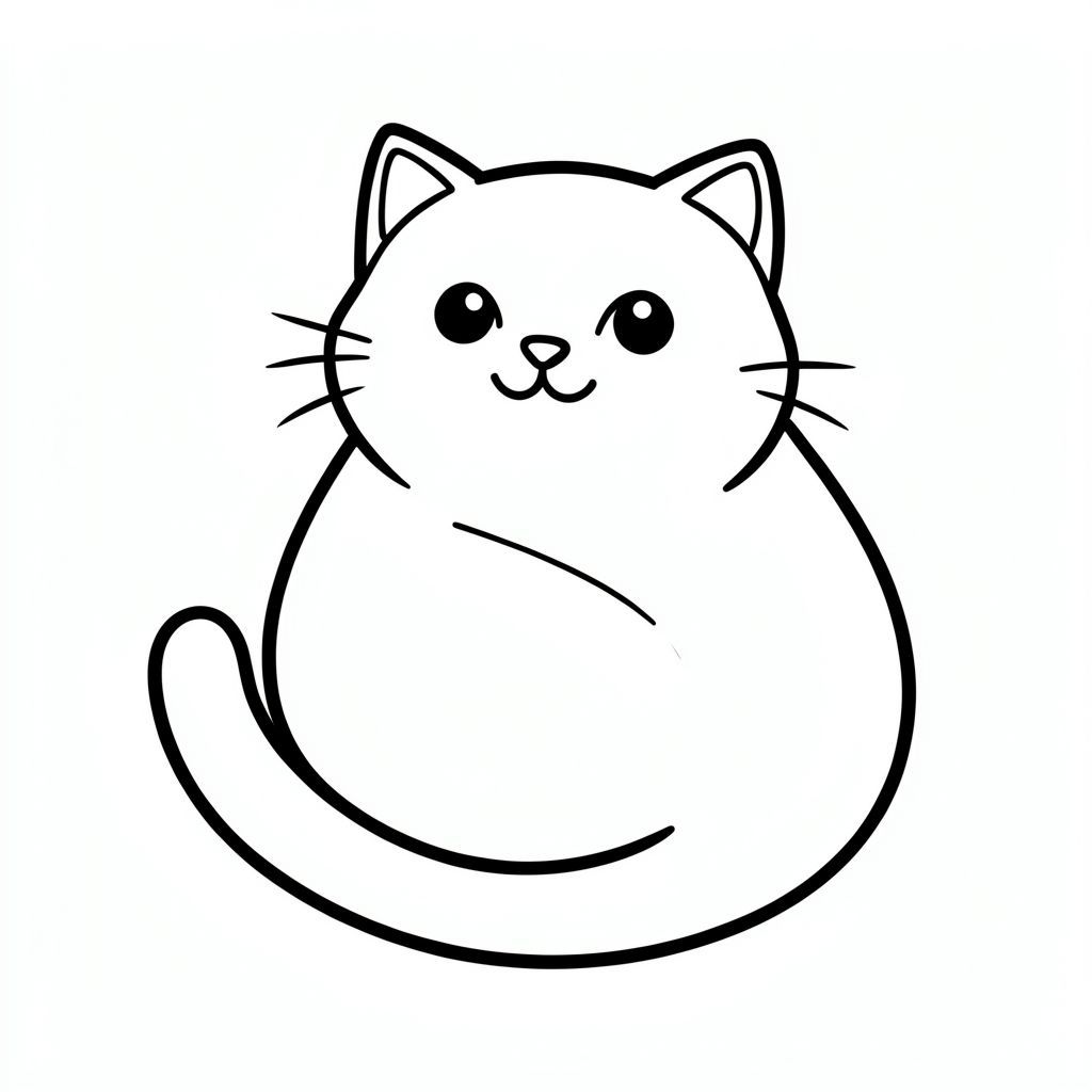 : Màu sắc Mô tả: Một con mèo nhỏ, mũm mĩm với khuôn mặt tròn trịa, thân thiện. Một đường đơn giản, dày, đậm phác thảo cơ thể mèo. Đầu của mèo ở giữa và hơi nghiêng lên trên. Đuôi dài và cong duyên dáng. Chú mèo nép mình trong một đường cong mềm mại, nhẹ nhàng., tô màu, nghệ thuật đường nét, nền trắng