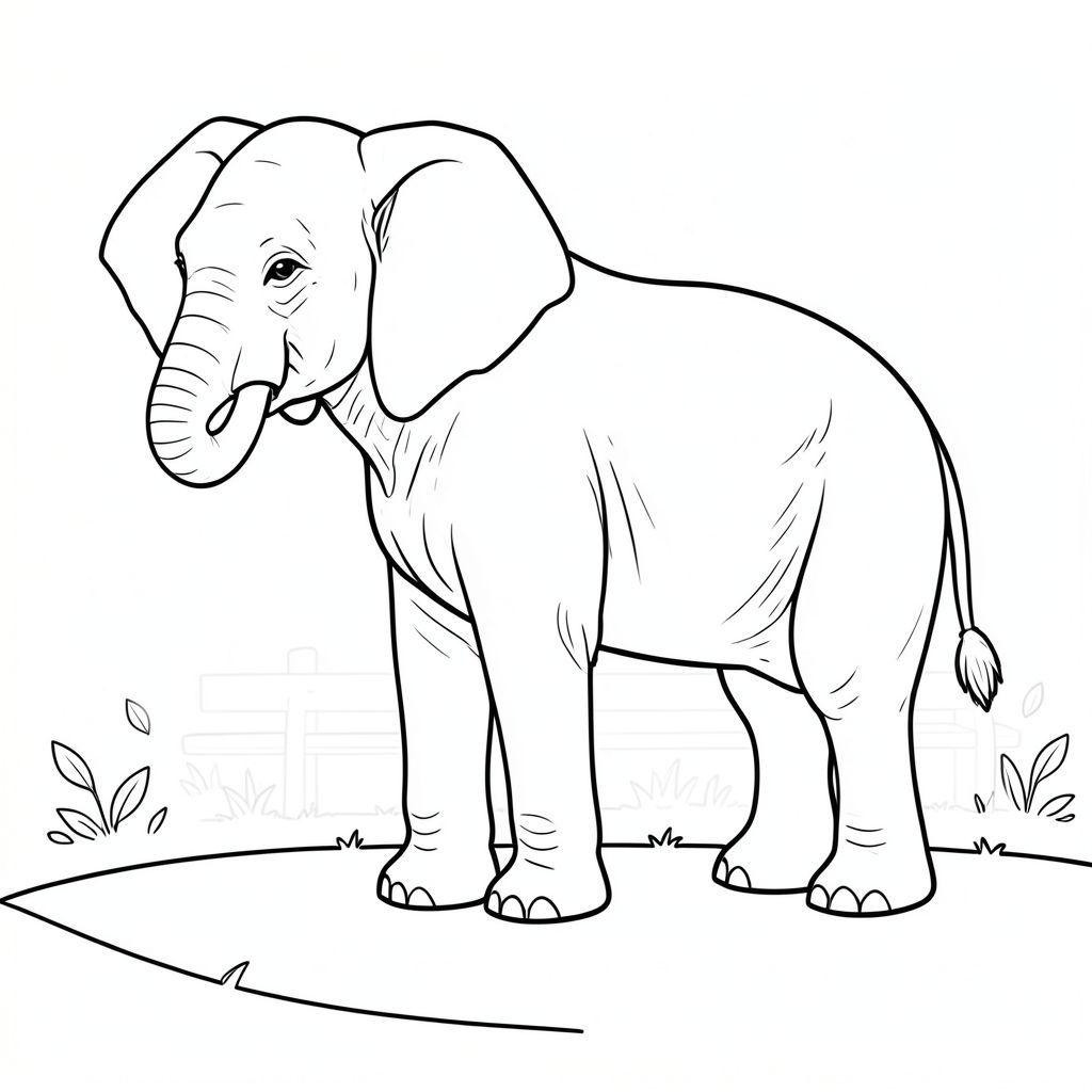 Bạn có muốn tôi tinh chỉnh bất kỳ khía cạnh nào của mô tả này không, có thể thêm một loại cỏ cụ thể hoặc một chi tiết tinh tế vào khuôn mặt voi?, trang màu, nghệ thuật đường nét, nền trắng