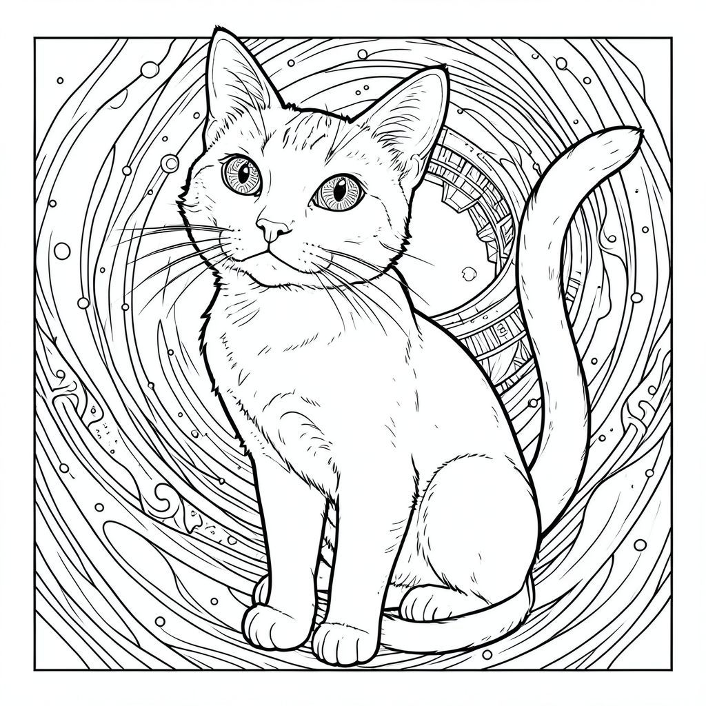 Bạn có muốn tôi giải thích chi tiết về bất kỳ khía cạnh cụ thể nào của mô tả này, có lẽ tập trung vào một chi tiết cụ thể về hình dạng hoặc nền của con mèo?, trang màu, nghệ thuật đường nét, nền trắng