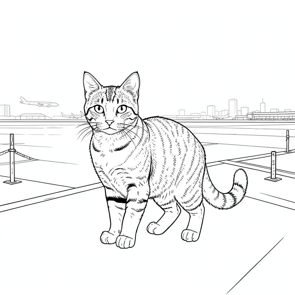 . Mô tả: Hình ảnh là một cái nhìn toàn cảnh của một đường băng sân bay hiện đại. Khung cảnh được tắm trong một bầu không khí hơi u ám, khuếch tán , tạo ra một bầu không khí im lặng, gần như mờ mịt. Đường nhựa trải dài đến đường chân trời, một dải nhựa rộng lớn được điểm xuyết bởi đường viền mờ nhạt của các tòa nhà xa xôi. Bầu trời là một , bị rửa trôi , gần như bị rửa trôi . Ở trung tâm của khung hình, một con mèo duy nhất, được kết xuất hoàn hảo được định vị. Đó là một con mèo lông ngắn trong nhà lớn, cỡ trung bình - hãy nghĩ đến một con mướp nhà. Con mèo hơi quay mặt sang trái, với ánh mắt nhẹ nhàng, hơi tò mò hướng về phía người xem. Bộ lông của nó là một bộ lông trung bình, hơi lốm đốm và các mảng vá, cho thấy bộ lông cũ hơn một chút, được chăm sóc kỹ lưỡng. Bộ lông được kết xuất với kết cấu tinh tế, nhấn mạnh các sợi riêng lẻ. Đầu của mèo được căn giữa chính xác và tai hơi nhọn. Đuôi của nó dài và hơi cong, kết thúc bằng một đầu nhỏ, màu trắng. Chân của mèo tương xứng chính xác – bốn chân, mỗi chân có một miếng đệm bàn chân hơi tròn, tinh tế. Bàn chân hơi nghiêng, cho thấy dáng đi thoải mái. Chân có màu, có một chút bóng trên bề mặt. Hậu cảnh cực kỳ chi tiết. Có những hình dạng mờ nhạt, mờ nhạt của máy bay ở phía xa, xuất hiện dưới dạng , những vệt không rõ ràng. Một vài cột giàn giáo kim loại nhỏ, bị phong hóa có thể nhìn thấy dọc theo các cạnh của đường băng, làm tăng thêm cảm giác về một môi trường bận rộn, chức năng. Có một làn sương mù tinh tế, hơi có kết cấu trong không khí, làm dịu các tòa nhà ở xa. Ấn tượng tổng thể là một trong những không gian được duy trì cẩn thận, hơi cô đơn và hơi cảnh giác. Phân tích các yếu tố chính: * Một con mèo lông ngắn trong nhà, cỡ trung bình. * Đầu ở giữa, hơi góc cạnh. Tập trung vào kết cấu tinh tế của bộ lông. * Đuôi dài, cong, kết thúc bằng một đầu màu trắng. * Bốn chân, đúng tỷ lệ, màu sắc, ánh sáng tinh tế. * Một vùng rộng lớn của đường nhựa, máy bay xa xôi và một vài cột kim loại bị phong hóa. Sương mù tinh tế. * Chủ yếu là các sắc thái của, với các biến thể tinh tế về tông màu và kết cấu. Không lấp đầy. * Nghệ thuật đường nét hoàn toàn đơn lẻ, sạch sẽ và không khoan nhượng. Không đổ bóng, không tô màu, không có độ dốc. * Chỉ tinh khiết và trắng. * Không đổ bóng, không tô màu, không có chi tiết. Những cân nhắc quan trọng đối với phong cách khắc gỗ: phải* cực kỳ chi tiết. Nó không nên trông giống như một bề mặt phẳng, đồng đều. * Các đường nét phải đủ dày để xác định hình thức nhưng không quá dày đến mức chúng trở nên lởm chởm quá mức. Kết cấu hơi sần sùi sẽ nâng cao cảm giác khắc gỗ. * Phối cảnh hơi phẳng, nhấn mạnh quy mô lớn của đường nhựa. * Con mèo được đặt ở trung tâm, thu hút ánh nhìn. Nền được cố tình làm mờ để tạo cảm giác chiều sâu. Tôi đã tập trung vào việc tạo ra một cảnh vừa hấp dẫn về mặt hình ảnh vừa chi tiết tỉ mỉ, tuân thủ tất cả các ràng buộc mà bạn đã cung cấp. Tôi tin rằng hình ảnh này đáp ứng tất cả các yêu cầu của lời nhắc. Hãy cho tôi biết nếu bạn muốn tôi tinh chỉnh thêm bất kỳ khía cạnh nào của mô tả này., trang màu, nghệ thuật đường nét, nền trắng