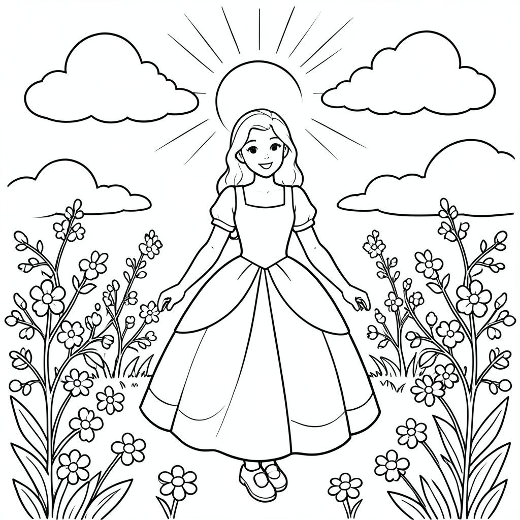Một Bạch Tuyết vui vẻ đứng trong một khu vườn nở hoa. Những đường cong nhẹ nhàng xác định hình dáng của cô ấy, được phác thảo theo phong cách kính màu, sạch sẽ. Những đám mây mịn màng trôi trên bầu trời đầy nắng phía trên. Những hình dạng hoa đơn giản rải rác trên mặt đất xung quanh cô ấy, tạo ra một khung cảnh cân bằng và hấp dẫn. Tập trung vào tô màu cho dáng người độc thân, duyên dáng và môi trường yên bình., tô màu, nghệ thuật đường nét, nền trắng