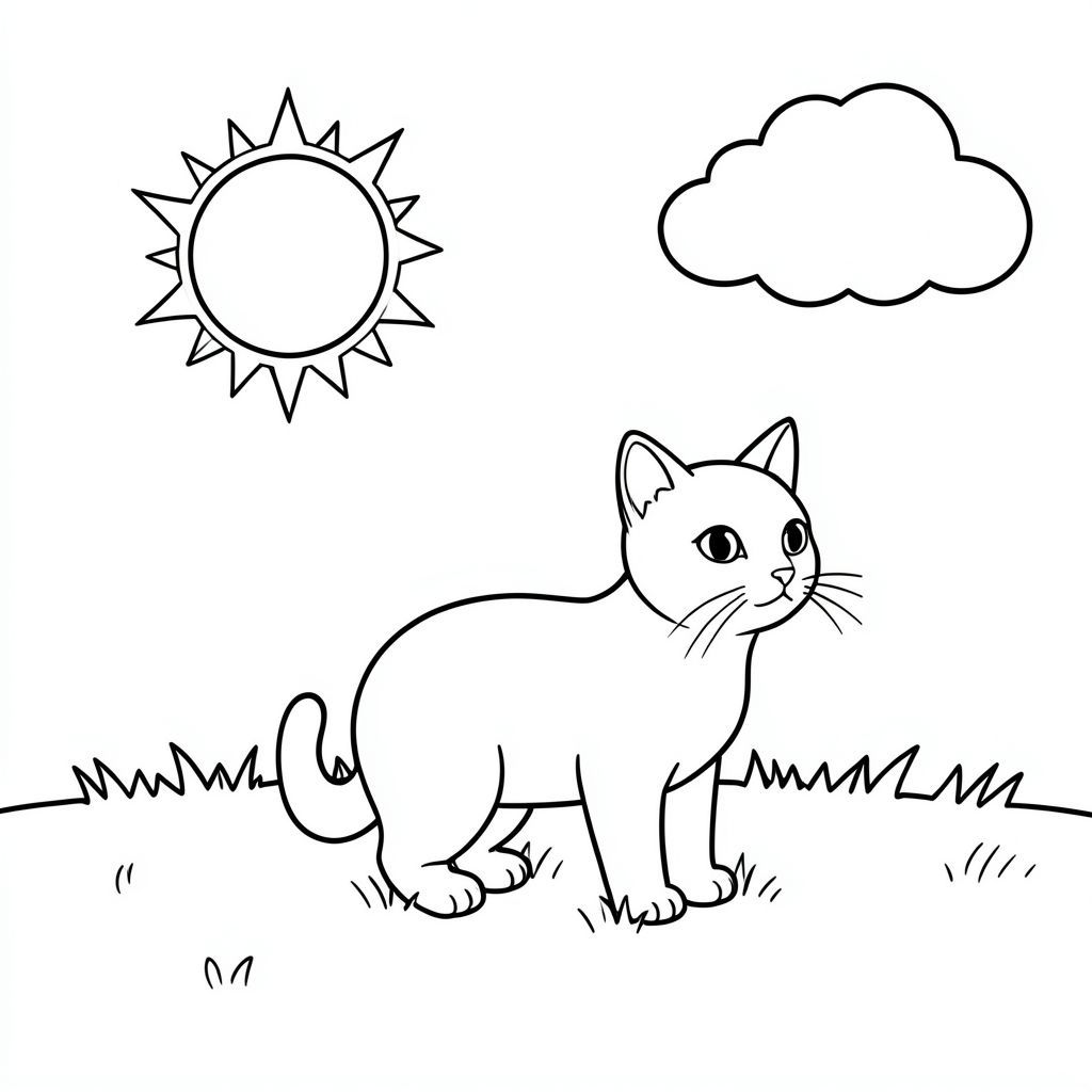Một cánh đồng cỏ nhỏ. Một mặt trời duy nhất nằm hơi bên trái trung tâm. Một đám mây mềm, phồng ở góc trên bên phải. Con mèo ở giữa, hơi quay mặt sang phải. Cỏ là một trang tô màu, nghệ thuật đường nét, nền trắng