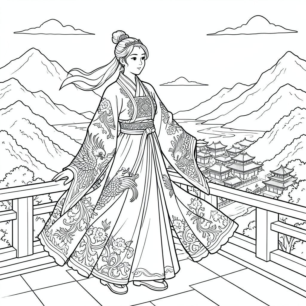 Một cảnh toàn trang của một Hoàng hậu uy nghiêm đứng trên ban công cung điện, mặc một chiếc hanfu bồng bềnh cầu kỳ với tay áo dài thêu, hoa văn phượng hoàng, lụa nhiều lớp, gió thổi mạnh mẽ, nhìn ra vương quốc núi sông rộng lớn của mình.