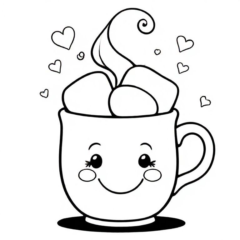 Một chiếc cốc tròn với khuôn mặt cười dễ thương ở mặt trước, hơi nước bốc lên thành những lọn tóc mượt mà, kẹo dẻo lấp ló trên đầu. Trái tim và nền ngôi sao đơn giản. Đường viền đậm dày, chi tiết tối thiểu, lý tưởng để tô màu.