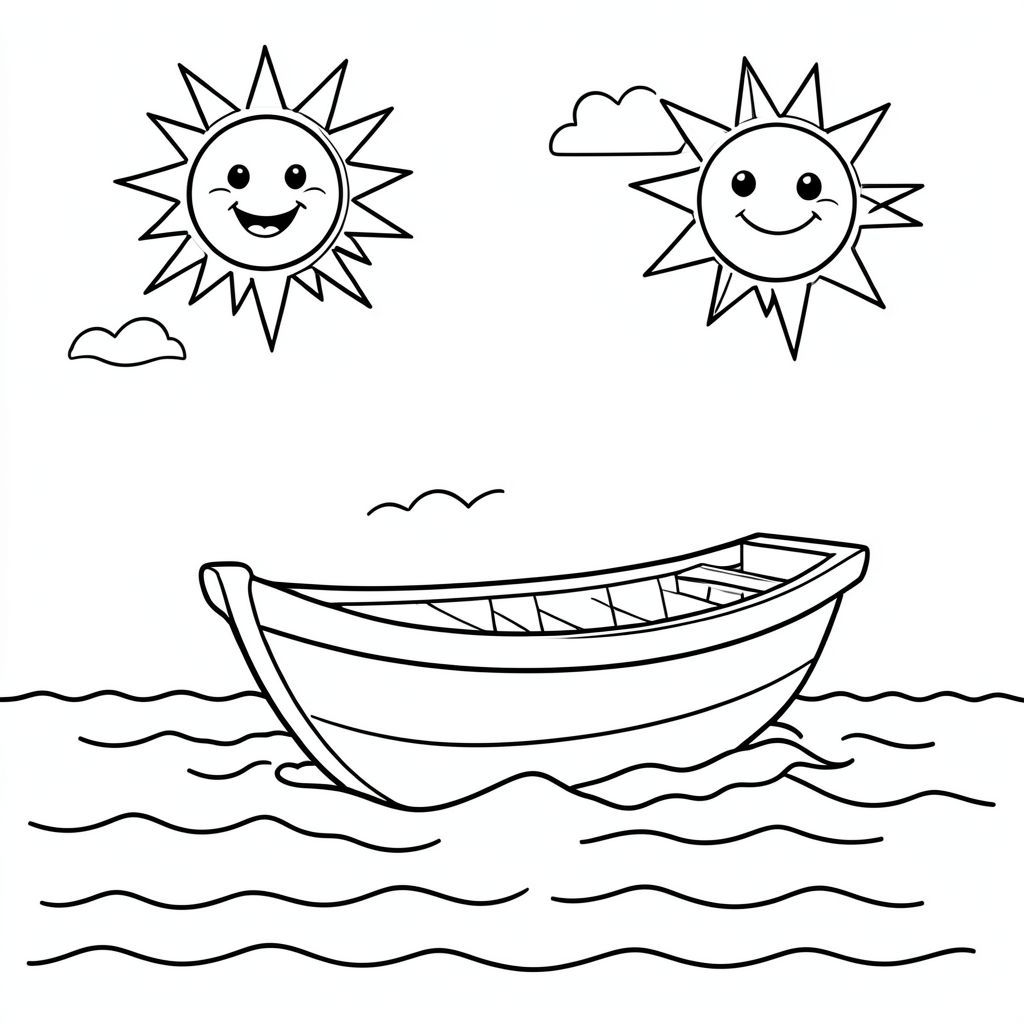 Một chiếc thuyền mỉm cười chèo thuyền trên biển với ánh nắng mặt trời và chim chóc.
