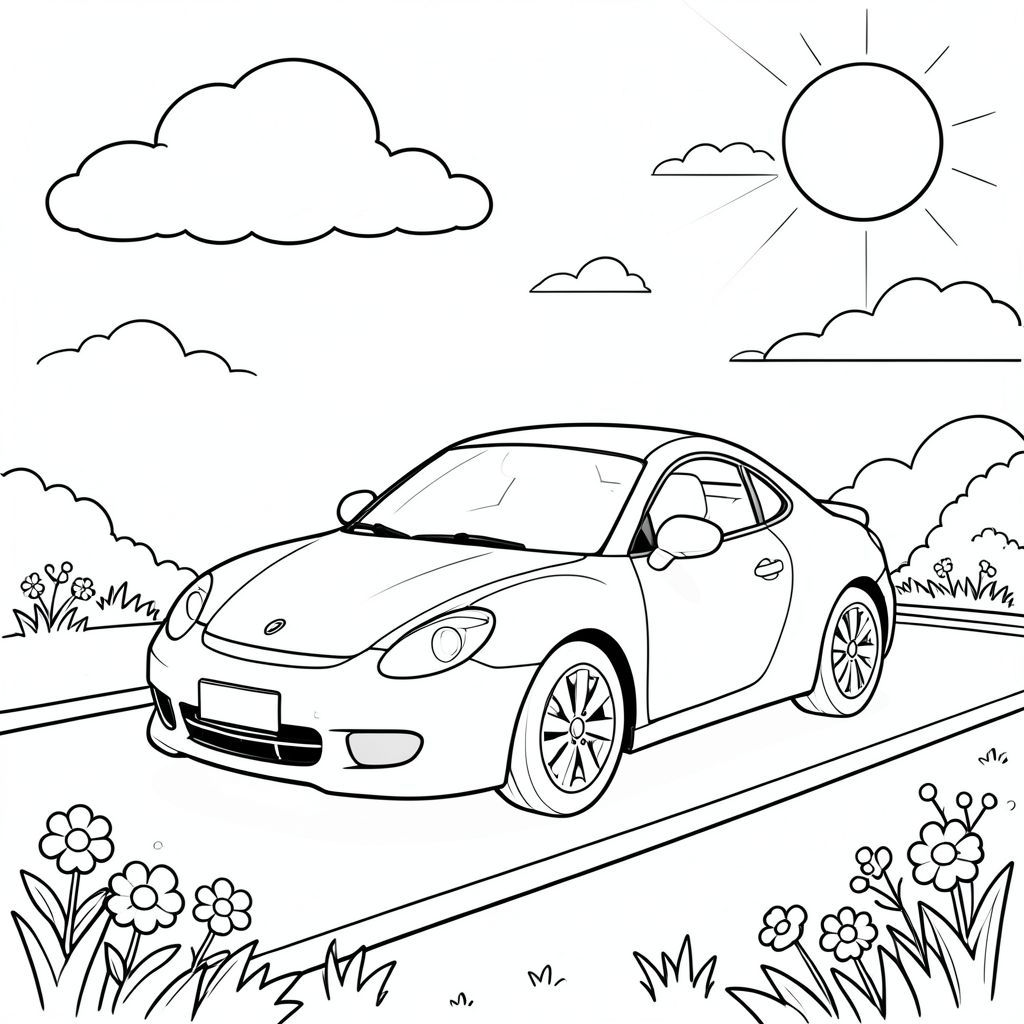 Một chiếc xe bóng bẩy ngồi yên bình trên con đường đầy nắng, những khúc cua mượt mà của nó bắt kịp . Chiếc xe có đầu tròn duy nhất với nội thất màu trắng có thể nhìn thấy qua kính chắn gió và phần đuôi duyên dáng thuôn nhọn. Những đám mây mềm mại trôi trên đầu theo hình dạng nhẹ nhàng, thỉnh thoảng đổ bóng trên bề mặt xe. Khung cảnh được bao quanh bởi một đường viền khu vườn đơn giản với cỏ mềm và một vài bông hoa nở rộ. Bố cục cân bằng vị trí trung tâm của chiếc xe với bầu trời rộng mở bên trên và phong cảnh yên bình bên dưới. Các đường nét rõ ràng, không bị đứt gãy xác định mọi đường cong và cạnh của ô tô, tạo ra một hình ảnh hài hòa và êm dịu hoàn hảo để tô màu. Thiết kế của chiếc xe nhấn mạnh vào các hình dạng hình học đơn giản và các đường nét uyển chuyển, không có chi tiết phức tạp hoặc yếu tố kết cấu. Mặt trời chiếu xuống từ góc trên bên phải, chiếu sáng bề mặt xe đồng đều làm nổi bật hình dáng thanh lịch của nó. Toàn bộ khung cảnh duy trì bầu không khí vui vẻ, ngây thơ không có yếu tố hoặc gây phiền nhiễu., tô màu, nghệ thuật đường nét, nền trắng