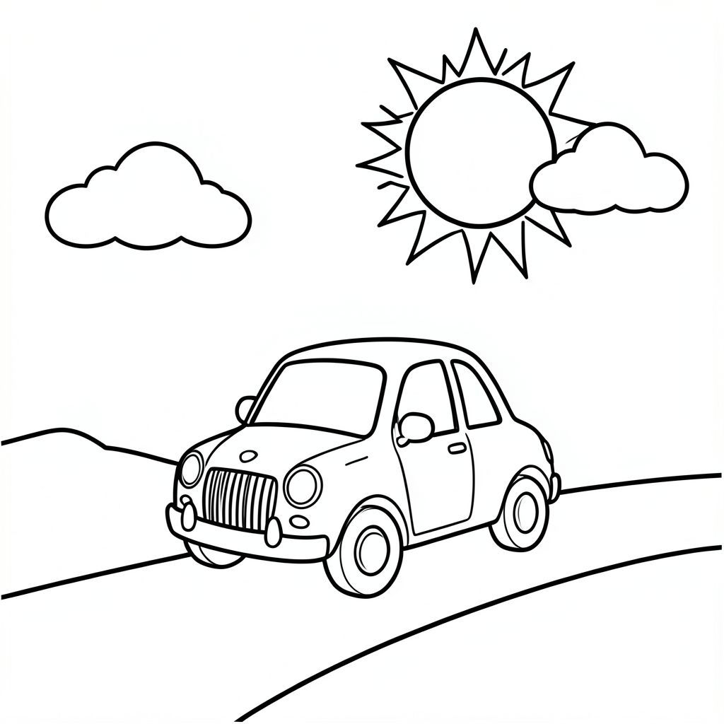 Một chiếc xe nhỏ dễ thương lái trên một con đường đơn giản với mặt trời lớn trên bầu trời và hai đám mây nhỏ, nghệ thuật đường nét đen trắng, đường viền táo bạo, không đổ bóng, phong cách sách tô màu cho trẻ em
