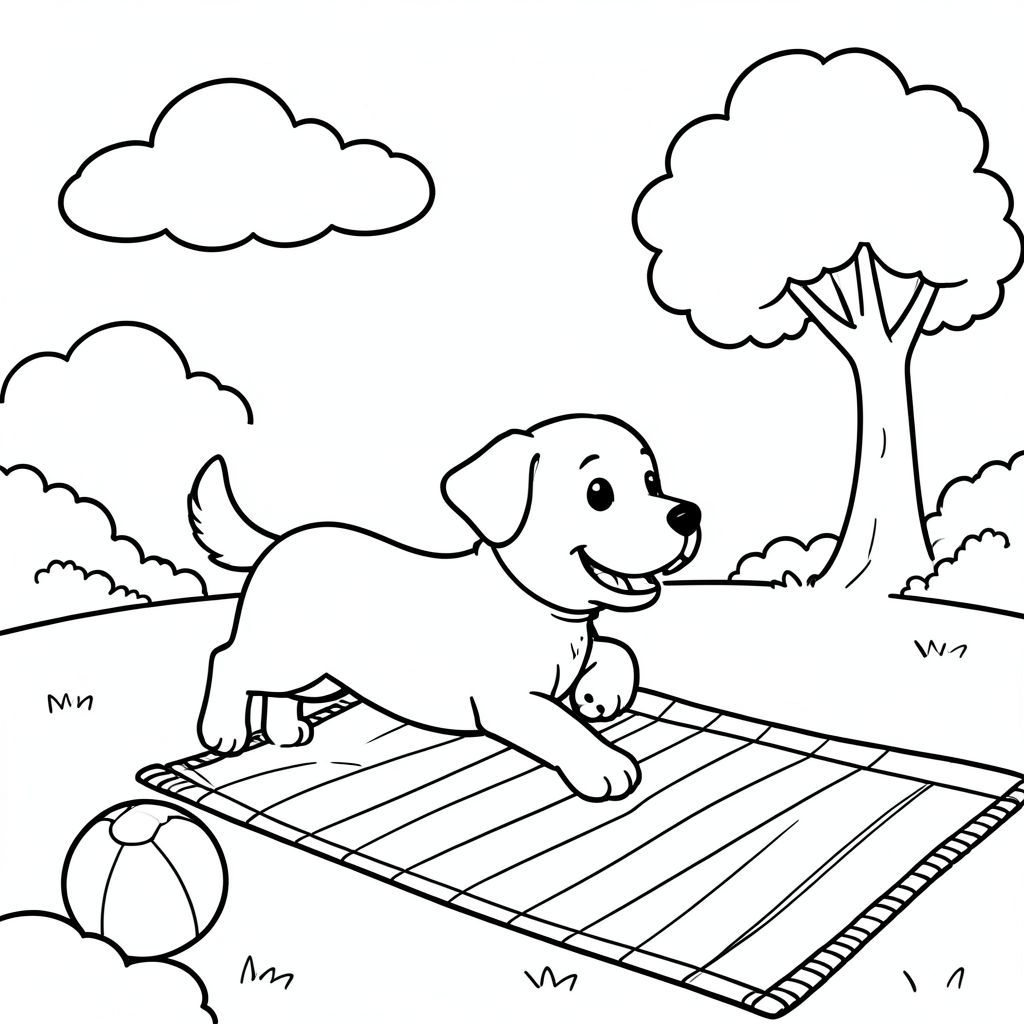 Một chú chó con vui vẻ vui vẻ đuổi theo một quả bóng đang mỉm cười trong một công viên sáng sủa, với một chiếc chăn dã ngoại, một vài đám mây mịn màng và một cái cây đơn giản ở hậu cảnh — được phác thảo rõ ràng để trẻ em dễ dàng tô màu.