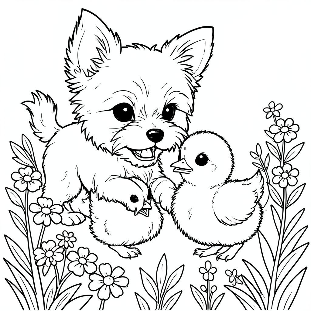 một chú chó con Yorkie trong một cánh đồng hoa gầm gừ và chơi đùa với gà con lông xù