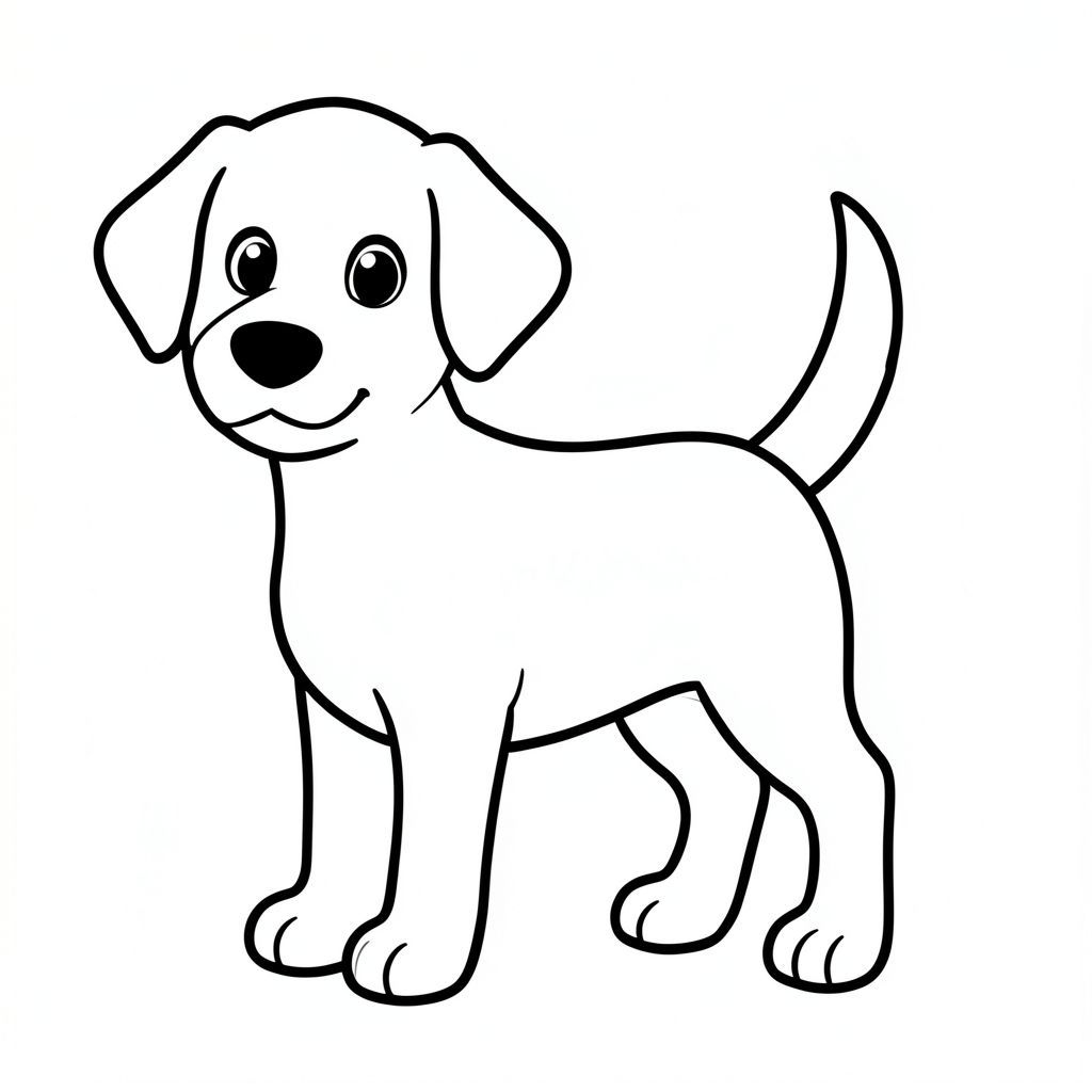 Một chú chó đơn giản, hạnh phúc được miêu tả. Một đuôi duy nhất có mặt, được đặt ở trung tâm. Khuôn mặt của có đặc điểm là đôi mắt to, biểu cảm. Cơ thể của chú chó được thể hiện với những đường viền dày, đậm, tạo nên hình dáng mạnh mẽ, rõ nét. Toàn bộ không gian nội thất được lấp đầy bởi màu trắng tinh khiết., tranh tô màu đen trắng, phong cách lowbook, nghệ thuật đường nét, đơn sắc, không màu, không bóng, không xám, không tô màu, nền trắng, chỉ phác thảo, phong cách vector, thiết kế phẳng, 2d, chính xác một đuôi duy nhất, hoàn toàn không tô màu đen, nội thất trắng tinh khiết, không có miếng mực, không văn bản, không từ, không tiêu đề, hoàn toàn không màu, Chỉ Pure Black and White Linarts