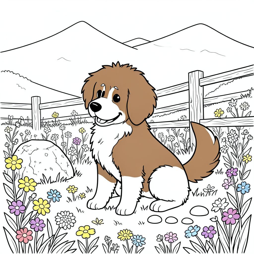 Một chú chó lông tơ với vẻ mặt vui vẻ ngồi trên đồng cỏ ngập tràn ánh nắng. Những bông hoa dại có màu sắc - vàng, tím và xanh lam - bao phủ bãi cỏ rộng lớn. Một tảng đá nhỏ, rêu phong nằm hơi lệch sang trái, cung cấp một điểm nghỉ ngơi. Phía sau, một con dốc thoai thoải dẫn lên một dãy núi xa xôi, mờ mịt. Một hàng rào gỗ phong hóa chạy dọc theo rìa đồng cỏ, che khuất một phần tầm nhìn. Một rải rác những viên đá nhẵn được sắp xếp gần bàn chân của. Bộ lông của có màu sô cô la ấm áp và đuôi của nó có màu gừng. Đuôi được đặt hơi lệch tâm, tạo ra một động lực tinh tế. Hậu cảnh được làm mờ nhẹ nhàng, gợi lên một phong cảnh rộng lớn, bình dị. Ấn tượng tổng thể là một trong những sự yên tĩnh yên bình và vẻ đẹp tự nhiên., tranh tô màu đen trắng, phong cách lowbook, nghệ thuật đường nét, đơn sắc, không màu, không đổ bóng, không xám, không tô màu, nền trắng, chỉ phác thảo, phong cách vector, thiết kế phẳng, 2d, chính xác một đuôi duy nhất, hoàn toàn không tô màu đen, nội thất trắng tinh khiết, không có miếng mực, không văn bản, không từ, không tiêu đề