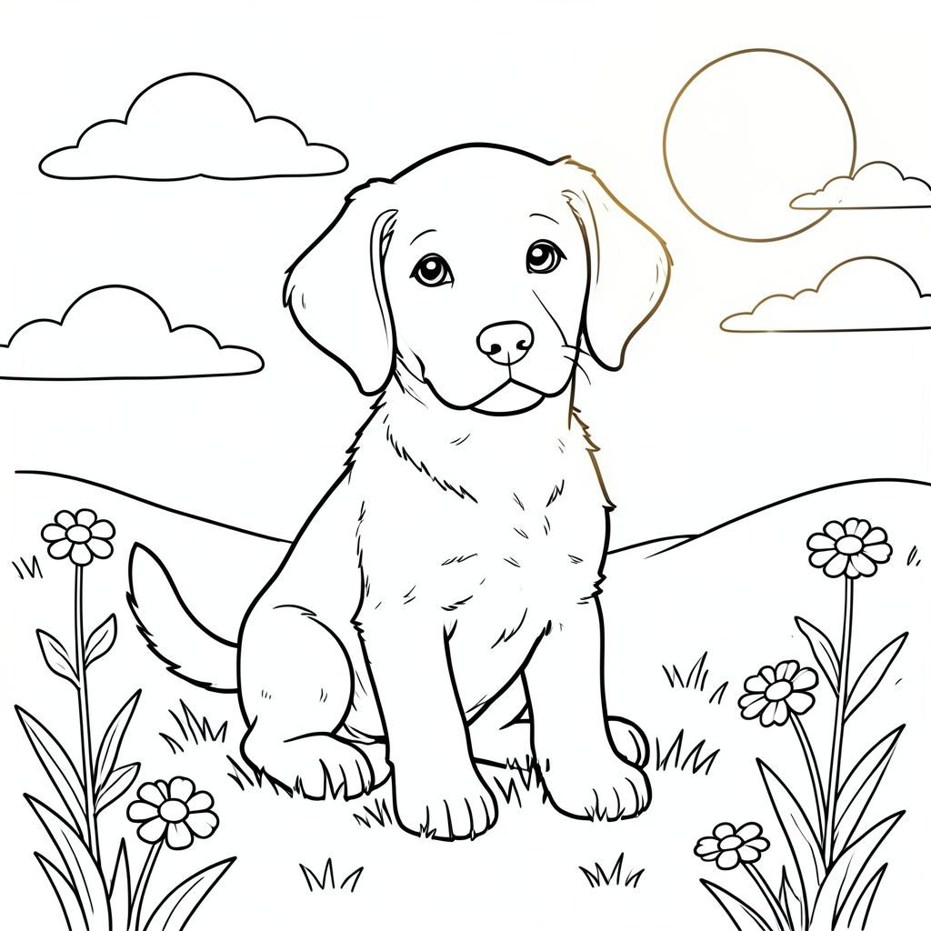 Một chú chó săn mồi ngồi yên bình trên đồng cỏ đầy nắng. Đầu chó hơi quay về phía người xem, tai nhẹ nhàng vỗ lên, đôi mắt dịu dàng và thân thiện. Đuôi của nó chậm rãi vẫy vẫy trong làn gió nhẹ. Hậu cảnh có bầu trời quang đãng với một vài đám mây trắng trôi qua. Một vài bông hoa dại rải rác trên cỏ xung quanh bàn chân của. Bố cục được cân bằng với chú chó ở giữa cảnh, mặt trời chiếu ánh sáng ấm áp từ góc trên bên phải. Bộ lông của chó con được thể hiện bằng những đường nét đơn giản, gọn gàng, không có bóng râm hay màu sắc. Toàn bộ khung cảnh được phác thảo bằng những đường nét rõ ràng trên nền trắng, tạo nên một hình minh họa truyện hoàn hảo. Biểu cảm của bình tĩnh và mãn nguyện, không có dấu hiệu đau khổ hay hung dữ. Môi trường đơn giản chỉ bao gồm các yếu tố cần thiết để tạo ra một khung cảnh yên bình, lành mạnh. Mặt trời xuất hiện dưới dạng hình tròn trên bầu trời, và những đám mây tròn nhẹ nhàng không có cạnh gồ ghề. Cỏ dưới bàn chân của chó được thể hiện bằng những đường nét đơn giản, sạch sẽ, không có kết cấu hay màu sắc. Bố cục tổng thể duy trì sự cân bằng hoàn hảo với là tâm điểm duy nhất của hình minh họa., trang màu, nghệ thuật đường nét, nền trắng