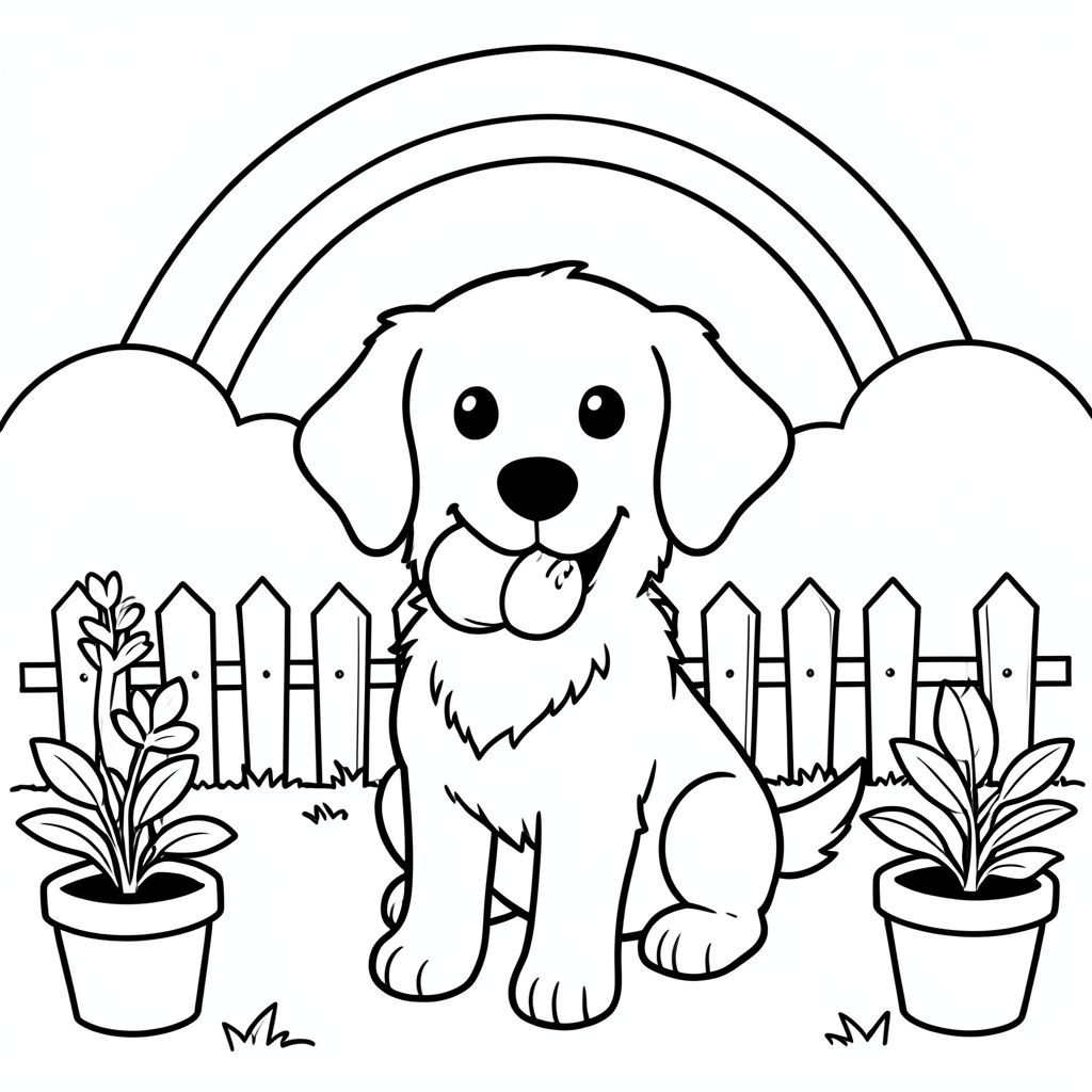 Một chú chó săn vàng hoạt hình thân thiện với nụ cười rạng rỡ, đôi tai mềm mại và cái đuôi vẫy vẫy, ngồi trong sân sau đầy nắng được bao quanh bởi chậu cây, hàng rào gỗ nhỏ và cầu vồng vòng cung trên đường chân trời. đang ngậm một quả bóng màu đỏ tươi trong miệng, sẵn sàng chơi. Các đường nét đơn giản, đậm để dễ dàng tô màu và hấp dẫn trẻ nhỏ.