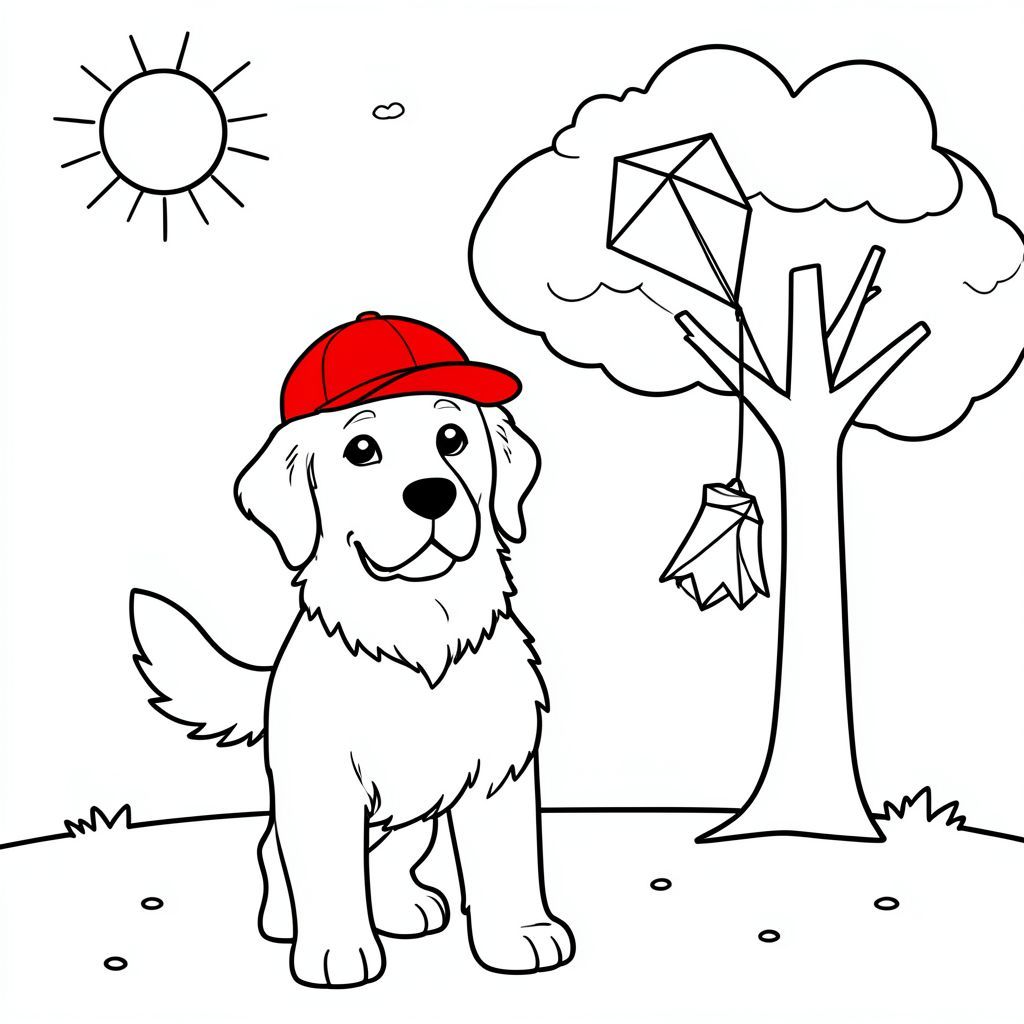 Một chú chó săn vàng thân thiện đội mũ bóng chày màu đỏ tươi, đứng trước một cái cây đơn giản, cách điệu với một con diều nhỏ treo trên cành cây. có đôi mắt to, hiền lành và cái đuôi vẫy vẫy, trong khi con diều táo bạo và đầy màu sắc với một vài đám mây trên bầu trời. Nền là tối thiểu, với ánh nắng mặt trời ở góc và một vài chấm để gợi ý một đồng cỏ xanh.