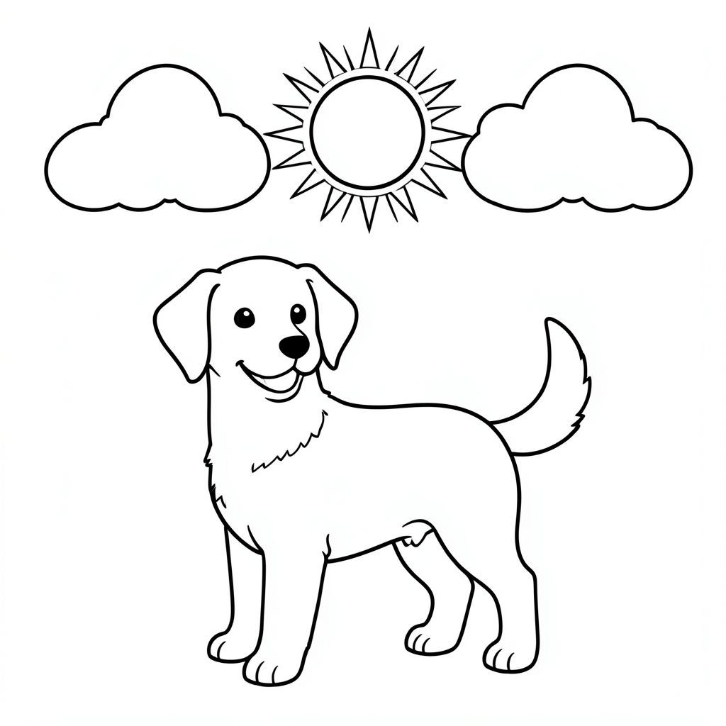 Một chú chó vui vẻ đứng dưới ánh nắng mặt trời và những đám mây mịn. Hình dạng của đơn giản và rõ ràng, sẵn sàng để tô màu. Các đường nét nhẹ nhàng xác định hình dạng của nó, tạo ra một khung cảnh cân bằng và dễ chịu. Một cái đuôi hạnh phúc nhẹ nhàng vẫy vẫy. Nền tối thiểu, cho phép tập trung vào., trang màu, nghệ thuật đường nét, nền trắng