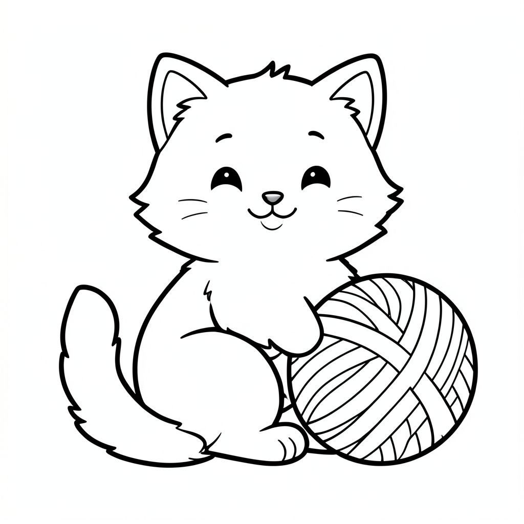 Một chú mèo hoạt hình lông tơ ngồi vui vẻ với một quả bóng sợi lớn! Các đường nét đậm và nền trắng giúp điều này dễ dàng tô màu. Không cần đổ bóng - chỉ cần rất nhiều niềm vui!, tranh tô màu đen trắng, phong cách lowbook, nghệ thuật đường nét, đơn sắc, không màu, không bóng, không xám, không tô màu, nền trắng, chỉ phác thảo, phong cách vector, thiết kế phẳng, 2d