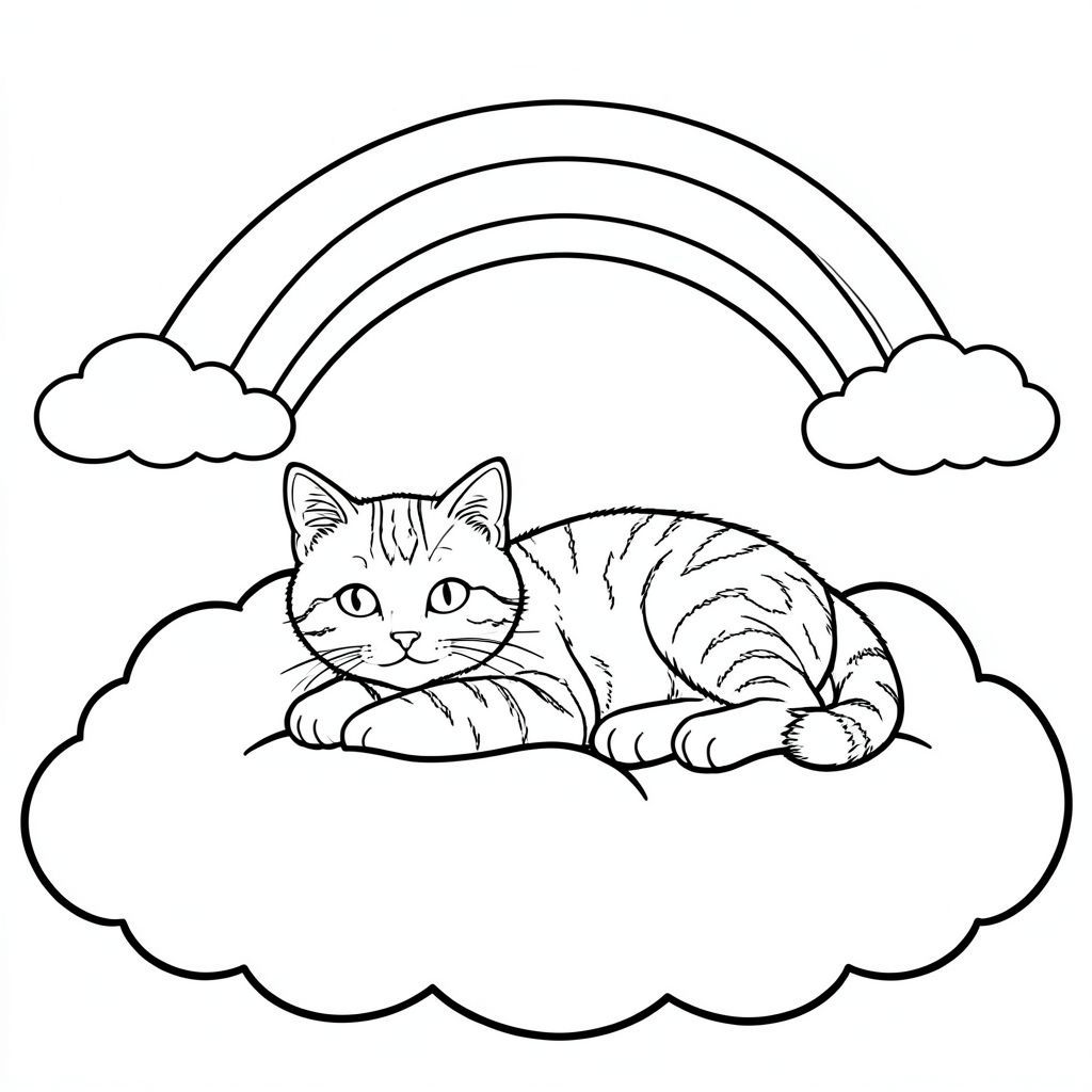 Một chú mèo mướp hiền lành nằm trên một đống mây mịn màng với cầu vồng cong trên bầu trời.