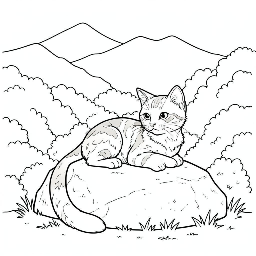 Một chú mèo mướp nhỏ nằm thoải mái trên một tảng đá phủ đầy rêu. Đầu con mèo hơi nghiêng, nhìn về phía một dãy núi mờ mịt xa xôi. Một mảng cỏ nhỏ bao quanh tảng đá, có kết cấu tinh tế với những đường nhô nhỏ. Đằng sau con mèo, một bụi cây rậm rạp, mượt mà che khuất tầm nhìn, tạo ra một phông nền mềm mại, im lặng.