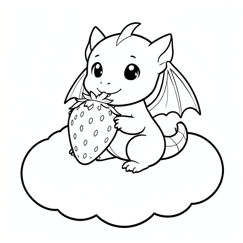 Một chú rồng con dễ thương ngồi trên mây, ăn một quả dâu tây khổng lồ, đường viền đơn giản, phong cách anime