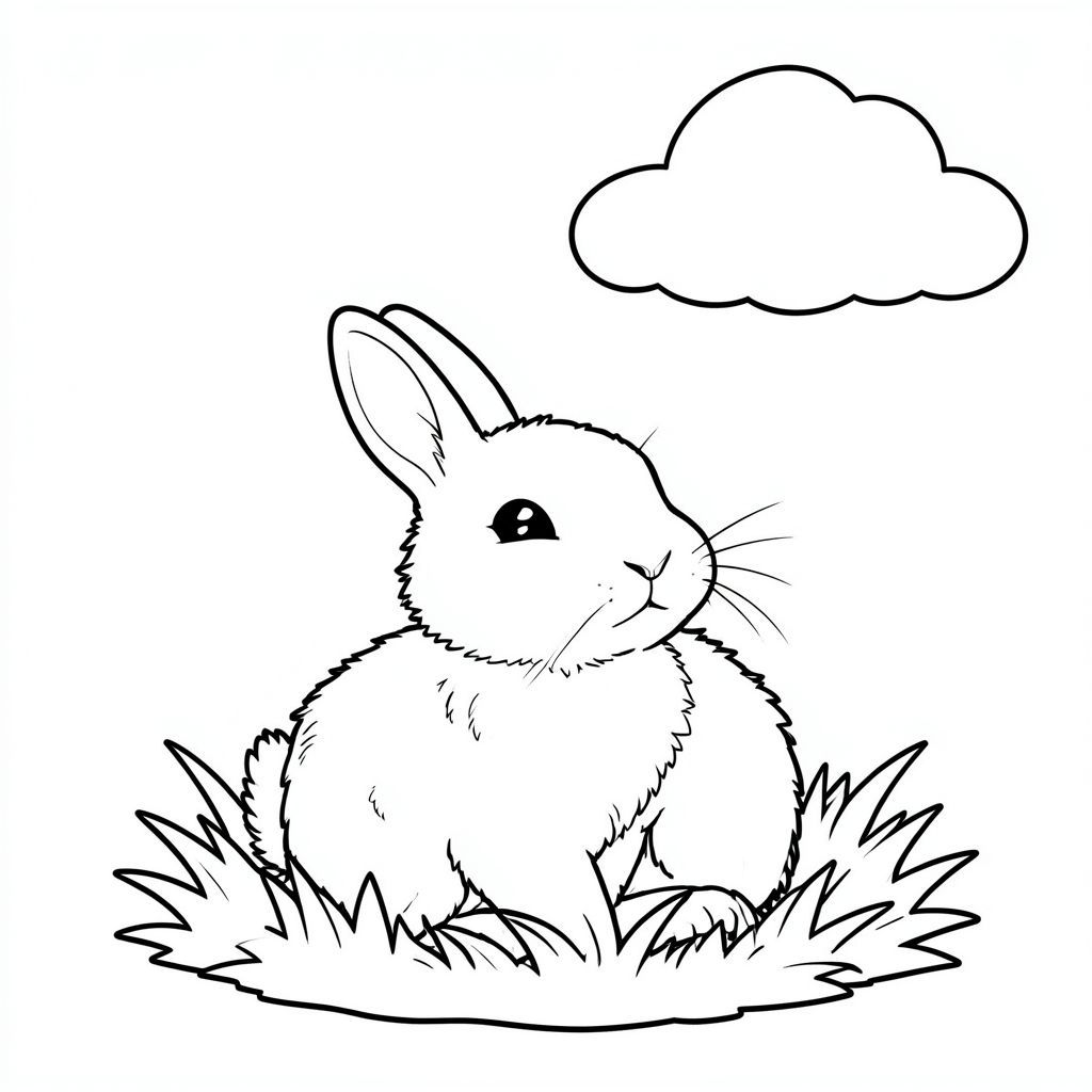 Một chú thỏ nhỏ, lông tơ ngồi nép mình giữa một mảng cỏ. Một tia nắng duy nhất, hoàn hảo làm ấm bộ lông của nó. Một đám mây nhẹ nhàng trôi trên đầu, tạo ra một . Đuôi thỏ hơi cong lại, tai nhếch lên, nhìn về phía mặt trời., tô màu, nghệ thuật đường nét, nền trắng