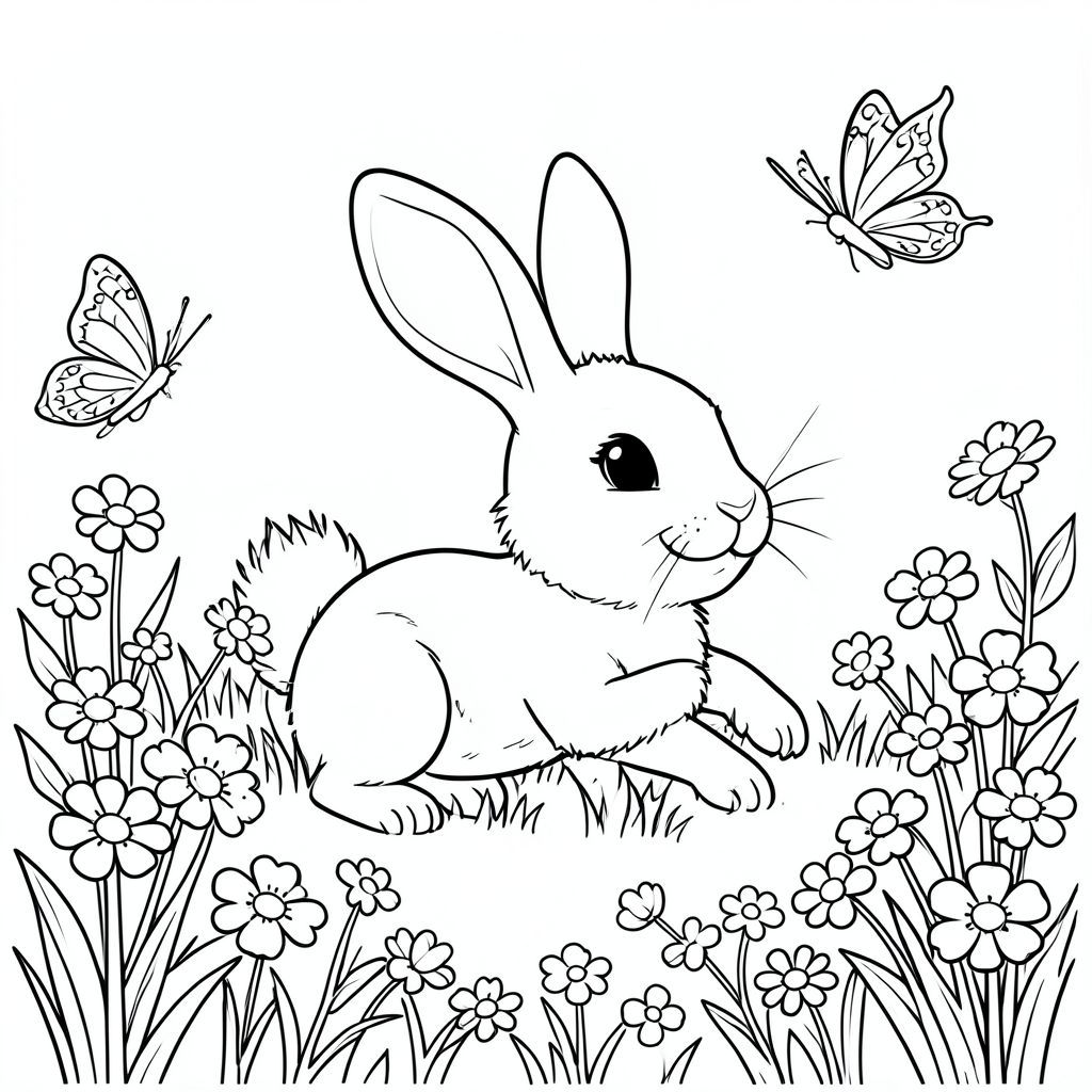 Một chú thỏ nhỏ vui vẻ đuổi bướm trên đồng cỏ đầy hoa, nghệ thuật đường nét đen trắng, trang tô màu đơn giản, đường viền sạch sẽ, không đổ bóng, dành cho trẻ em