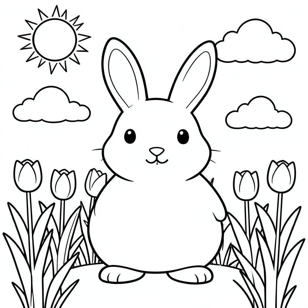 Một chú thỏ to lớn, thân thiện với thân hình tròn trịa và đôi tai dài đứng trên đồng cỏ đầy nắng đầy hoa tulip cao. Một mặt trời đơn giản, rực rỡ nằm ở góc trên cùng, và một vài đám mây mịn trôi trên bầu trời. Đường viền dày và rõ ràng, có không gian mở bên trong chú thỏ và những bông hoa để trẻ em dễ dàng tô màu. Không có chi tiết phức tạp, chỉ có hình dạng táo bạo và bầu không khí vui vẻ cho một hoạt động tô màu vui nhộn.