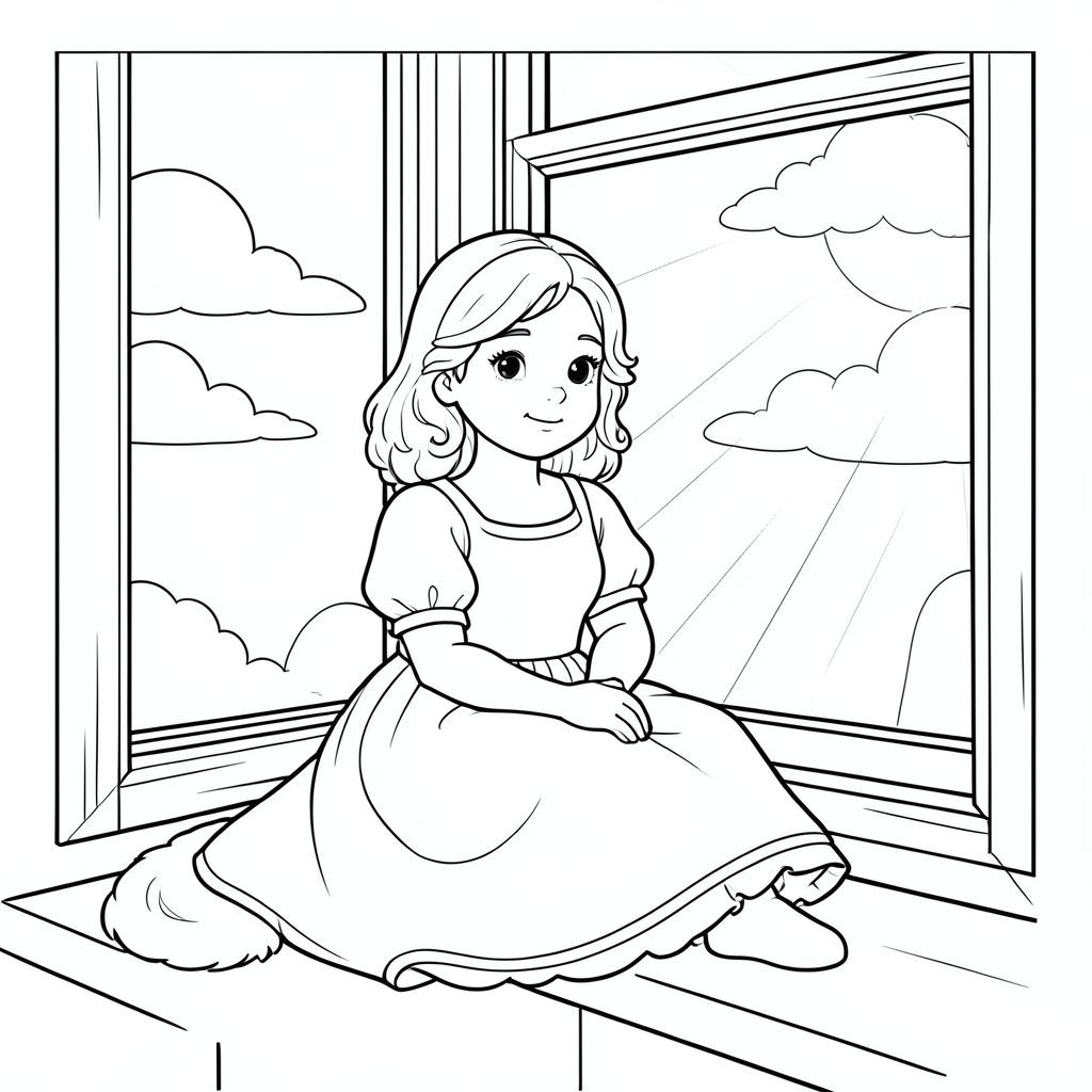 Một cô bé Lọ Lem trẻ tuổi ngồi yên bình trên bệ cửa sổ, khuôn mặt dịu dàng được bao quanh bởi những lọn tóc mềm mại. Cô mặc một chiếc váy trắng đơn giản với đường viền viền, hai tay khoanh trong đùi. Sau lưng cô, một mặt trời ấm áp chiếu qua cửa sổ, chiếu những tia nắng dịu dàng qua khung cảnh. Những đám mây trôi trên bầu trời quang đãng phía trên. Bố cục cân bằng vị trí ngồi của nhân vật với cửa sổ mở và bầu trời. Đuôi cô lặng lẽ đặt bên cạnh, và vẻ mặt của cô thể hiện sự hài lòng bình tĩnh. Nền có khung cửa sổ bằng gỗ đơn giản và ánh sáng mặt trời dịu nhẹ chiếu vào. Toàn bộ cảnh duy trì các đường nét đơn giản, sạch sẽ, không có chi tiết hoặc bóng phức tạp. Hình minh họa tập trung hoàn toàn vào hình tượng độc đáo của Lọ Lem trong khoảnh khắc yên bình của cô ấy., trang màu, nghệ thuật đường nét, nền trắng
