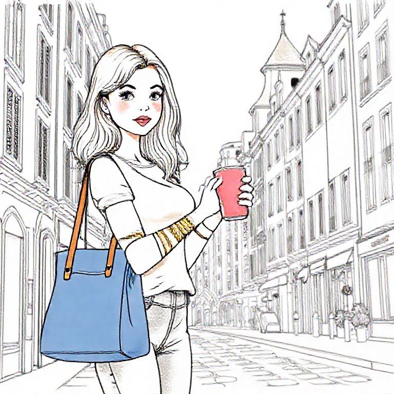 Một cô gái xinh đẹp với khuôn mặt trái xoan, hẹp và mái tóc nâu vàng, được trang điểm bằng mascara và đôi môi đỏ hồng. Cô mang theo một chiếc túi xách màu xanh lam với dây đai màu nâu, trên đó treo một chiếc kẹp tóc họa tiết da báo. Cô ấy mặc một chiếc áo cổ lọ không tay, màu be, hai chiếc vòng tay vàng (một mỏng, một dày) và quần jean xám. Trên tay, cô cầm một cốc cà phê màu hồng có nắp đen khi băng qua một con phố đầy nắng ở một thị trấn Ý với những tòa nhà cao tầng, đầy màu sắc.