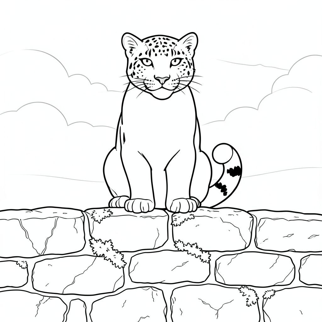 Bức tường được xây dựng bằng đá phong hóa, đầy những vết nứt nhỏ và bề mặt không bằng phẳng. Những mảng rêu bám vào đá, tạo ra một lớp kết cấu tinh tế. Các đường trắng nhỏ, gần như vô hình, xác định các vết nứt và kẽ hở, bắt chước sự hình thành tự nhiên của đá. Một mảnh địa y duy nhất, được đặt hoàn hảo bám vào mép tường, tạo thêm một chút màu sắc tinh tế. Hậu cảnh là một dải đá trầm liền mạch, kéo dài đến một khoảng cách mờ mịt, chỉ bị ngắt quãng bởi ánh sáng dịu dàng, khuếch tán của những đám mây u ám ở xa. Không có chi tiết nào có thể nhìn thấy ngoài hòn đá và con báo. Trọng tâm hoàn toàn là hình dạng đơn lẻ của con báo., tranh tô màu đen trắng, phong cách lowbook, nghệ thuật đường nét, đơn sắc, không màu, không bóng, không xám, không tô màu, nền trắng, chỉ phác thảo, phong cách vector, thiết kế phẳng, 2d, chính xác một đuôi duy nhất, hoàn toàn không tô màu đen, nội thất trắng tinh khiết, không có miếng mực, không có văn bản, không từ, không tiêu đề, hoàn toàn không màu, Chỉ Pure Black and White Linarts