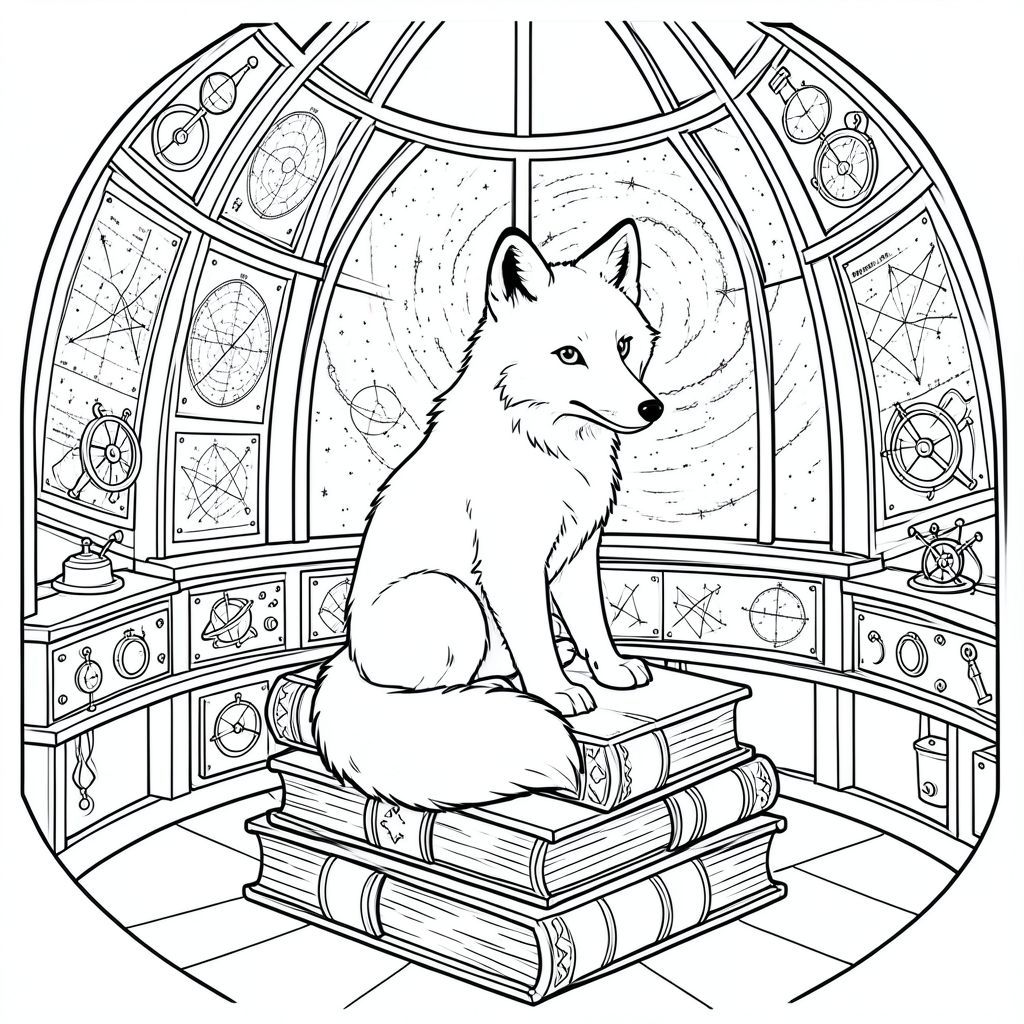 Một con cáo Bắc Cực lông tơ ngồi đậu trên một chồng sách cổ, bìa da trong một đài quan sát hình tròn, ấm cúng. Các bức tường của đài quan sát được lót bằng các biểu đồ sao chi tiết và các dụng cụ thiên văn. Một cửa sổ lớn, hình vòm để lộ một tinh vân xoáy với màu sắc mềm mại trên bầu trời đêm. Đuôi của con cáo uốn cong nhẹ nhàng xung quanh những cuốn sách. Các đường nét rõ ràng, sắc nét xác định hình dạng của cáo và các chi tiết của đài quan sát., trang màu, nghệ thuật đường nét, nền trắng