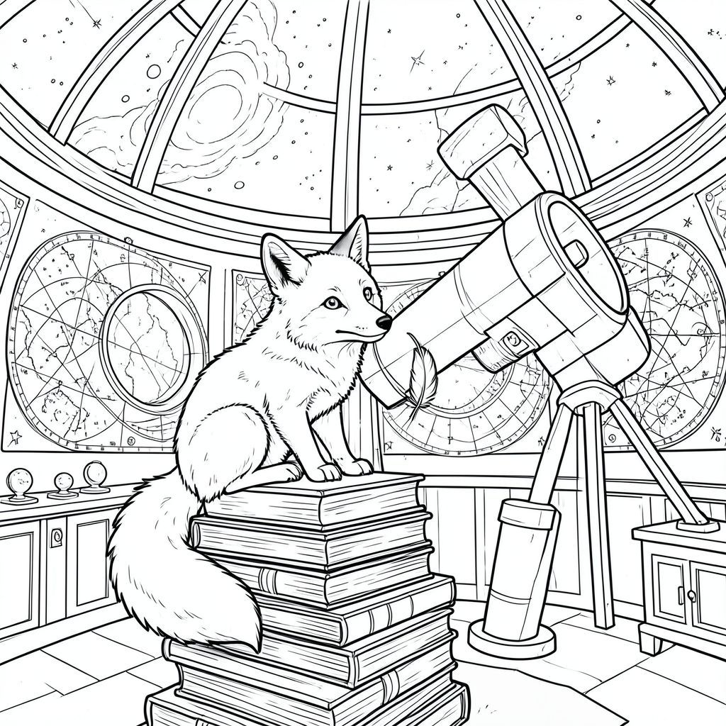 Một con cáo Bắc Cực tò mò ngồi đậu trên một chồng sách cổ cao chót vót trong một đài quan sát ấm cúng, ngập tràn ánh nắng. Các bức tường của đài quan sát được lót bằng các biểu đồ thiên thể phức tạp và một kính viễn vọng mở, khổng lồ hướng về phía một tinh vân xoáy trên trần nhà hình vòm. Bụi nhảy múa trong bộ lọc qua một cửa sổ tròn, chiếu sáng cái đuôi lông tơ của con cáo cuộn tròn gọn gàng quanh bàn chân của nó. Đầu của con cáo hơi nghiêng, như thể đang chăm chú nghiên cứu vũ trụ. Một chiếc lông vũ mỏng manh trôi xuống từ trên cao, nhẹ nhàng đáp xuống gần mũi cáo., trang màu, nghệ thuật đường nét, nền trắng