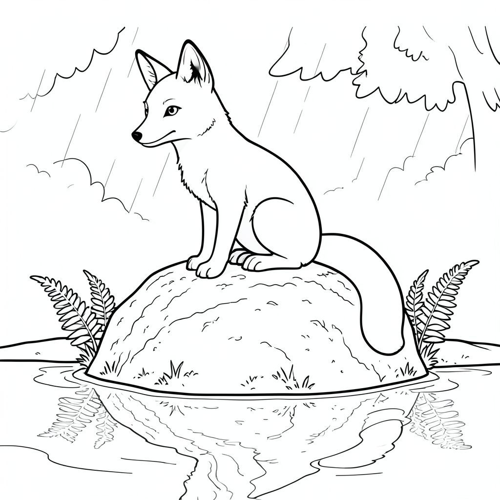 Một con cáo đơn lẻ, đầy đặn, ngồi đậu trên đỉnh một tảng đá phủ đầy rêu. Tảng đá bị nhấn chìm một phần trong một vũng nước nông, nước phản chiếu bầu trời mờ nhạt, u ám. Những cây dương xỉ nhỏ, mỏng manh mọc lên từ gốc tảng đá, các cạnh của chúng được xác định rõ ràng. Đầu của con cáo là một hình bầu dục hoàn hảo, hơi nghiêng, đôi mắt của nó và thông minh, được bao quanh bởi một sự tinh tế, gần như không thể nhận thấy, . Một cái đuôi dài, mỏng manh, cuộn tròn phía sau nó, biến mất vào mặt đất ẩm ướt. Bề mặt đá có kết cấu nặng, với các đường gờ và rãnh nhỏ bắt chước bề mặt đất gồ ghề. Mặt nước phản chiếu hình ảnh mờ, lốm đốm của cây cối xung quanh, hầu hết và một phần bị che khuất bởi mưa. Trọng tâm là đầu và đuôi cáo, và kết cấu tinh tế của tảng đá. Không có chi tiết nào ngoài hai yếu tố này., tranh tô màu đen trắng, phong cách lowbook, nghệ thuật đường nét, đơn sắc, không màu, không đổ bóng, không xám, không tô màu, nền trắng, chỉ phác thảo, phong cách vector, thiết kế phẳng, 2d, chính xác một đuôi duy nhất, hoàn toàn không tô màu đen, nội thất trắng tinh khiết, không có miếng mực, không văn bản, không từ, không tiêu đề, hoàn toàn không màu, chỉ vẽ đường đen trắng tinh khiết