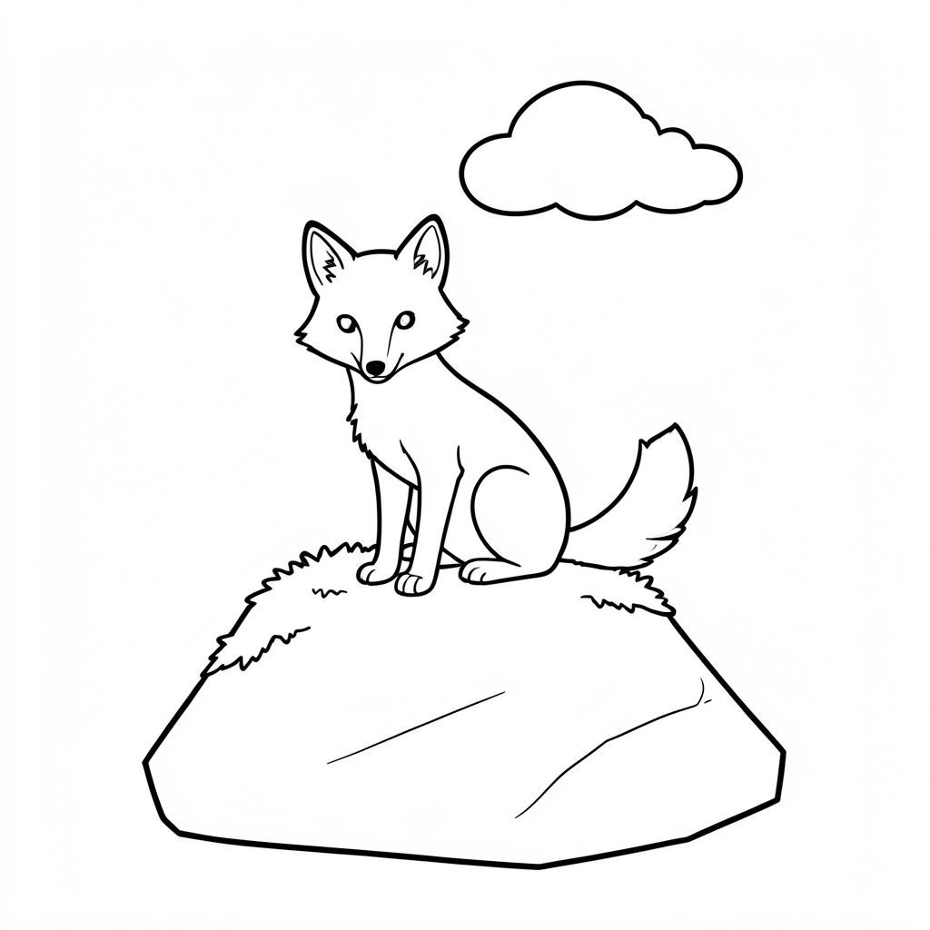 Một con cáo đơn lẻ ngồi trên một tảng đá rêu phong. Một đám mây nhỏ trôi dạt phía trên. Một tảng đá duy nhất, hơi nghiêng tạo thành cơ sở., trang màu, nghệ thuật đường nét, nền trắng