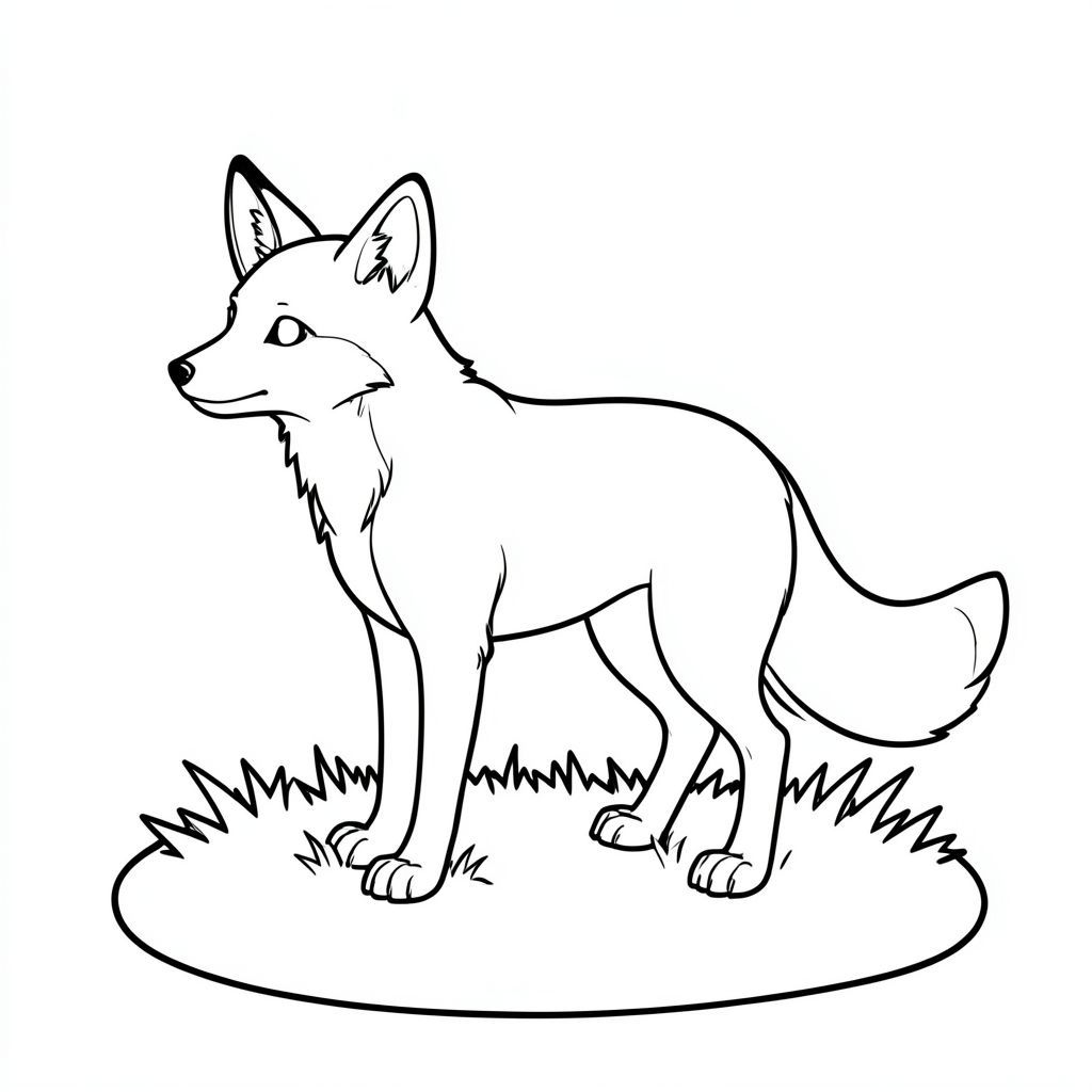 Một con cáo duy nhất, đứng trên một bãi cỏ., tô màu, nghệ thuật đường nét, nền trắng