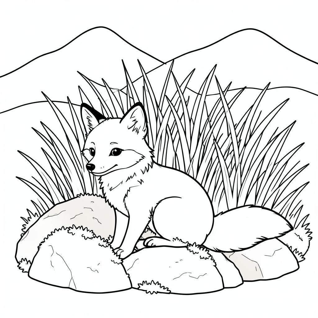 Một con cáo nhỏ, lông tơ ngồi nép mình giữa một cụm đá phủ đầy rêu. Nó hơi hướng về bên trái, với một đường cong nhẹ nhàng ở lưng. Những tảng đá có màu cát trầm lặng, và rêu có màu bạc. Đằng sau con cáo, một đám cỏ cao mọc lên, hơi mờ nhạt thành một dãy núi mờ mịt xa xăm. Những ngọn núi được thể hiện với những đường cong nhẹ nhàng, gợi lên một hình dạng tròn trịa, mềm mại. Một cái đuôi dài, duy nhất kéo dài từ phía bên phải của cáo, uốn cong duyên dáng xuống dưới. Đuôi là một phong phú, , tương phản với tông màu sáng hơn của cỏ và đá. Nền được lấp đầy bởi một vùng đất mềm mại, có kết cấu của , tạo cảm giác chiều sâu và rộng rãi. Bộ lông của cáo được xác định một cách tinh tế, với các biến thể nhẹ nhàng về tông màu., tranh tô màu đen trắng, phong cách lowbook, nghệ thuật đường nét, đơn sắc, không màu, không bóng, không xám, không tô màu, nền trắng, chỉ phác thảo, phong cách vector, thiết kế phẳng, 2d, chính xác một đuôi duy nhất, hoàn toàn không tô màu đen, nội thất trắng tinh khiết, không có miếng mực, không có văn bản, không có từ, không có tiêu đề, Hoàn toàn không có màu, chỉ có lineart đen trắng thuần túy