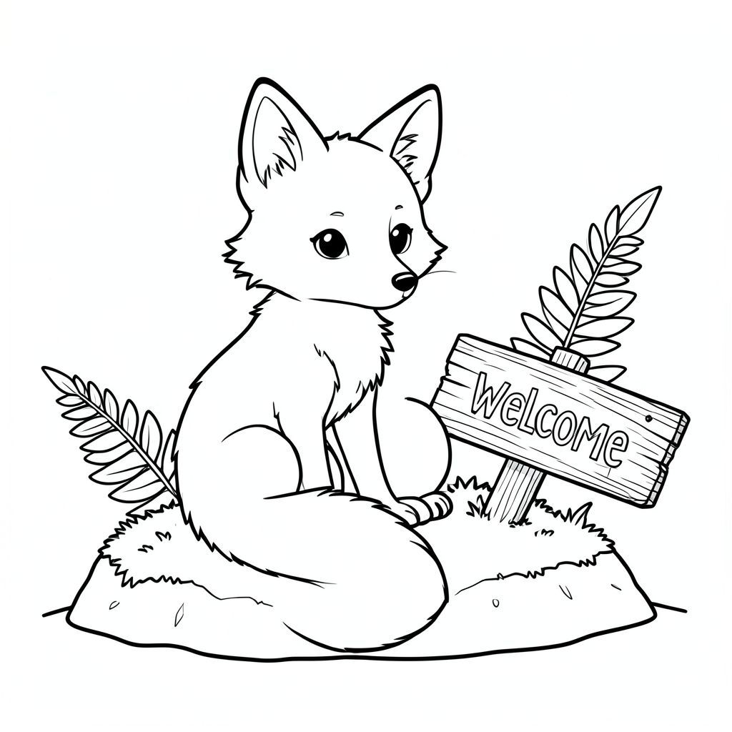 Một con cáo nhỏ, lông tơ ngồi nép mình trên một tảng đá rêu phong. Một tấm biển gỗ nhỏ, bị phong hóa hơi nghiêng sang một bên, hiển thị từ "Chào mừng". Một cây dương xỉ mọc gần đó, những chiếc lá mỏng manh của nó hơi xòe ra. Bộ lông của cáo có màu kem, và đôi mắt của nó là một , tò mò . Một đường mỏng kéo dài từ lưng dưới của nó, tạo thành một cái đuôi. Nền là một mềm mại, tắt tiếng , tạo cảm giác chiều sâu. Nghệ thuật đường nét được tỉ mỉ chi tiết, với các cạnh sắc nét, chính xác. Không gian bên trong là màu trắng tinh khiết, cho phép hình dạng của cáo nổi bật., tranh tô màu đen trắng, phong cách lowbook, nghệ thuật đường nét, đơn sắc, không màu, không bóng, không xám, không tô màu, nền trắng, chỉ phác thảo, kiểu vector, thiết kế phẳng, 2d, chính xác một đuôi duy nhất, hoàn toàn không tô màu đen, nội thất trắng tinh khiết, không có miếng mực, không có văn bản, Không từ, không tiêu đề, hoàn toàn không màu, chỉ có lineart đen trắng thuần túy