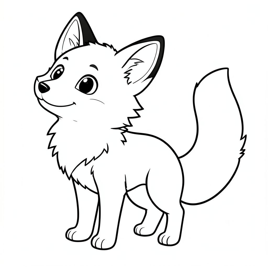 Một con cáo nhỏ, lông tơ với đôi mắt mở to. Bộ lông của nó ấm áp, . Một cái đuôi dài, màu trắng duy nhất kéo dài từ lưng của nó. Khuôn mặt của con cáo hơi nghiêng lên trên, thể hiện biểu cảm dịu dàng, hạnh phúc. Nền là một trang tô màu mềm, ., đen trắng, phong cách lowbook, nghệ thuật đường nét, đơn sắc, không màu, không bóng, không xám, không tô màu, nền trắng, chỉ phác thảo, phong cách vector, thiết kế phẳng, 2d, chính xác một đuôi duy nhất, hoàn toàn không tô màu đen, nội thất trắng tinh khiết, không có miếng mực, không văn bản, không từ, không tiêu đề