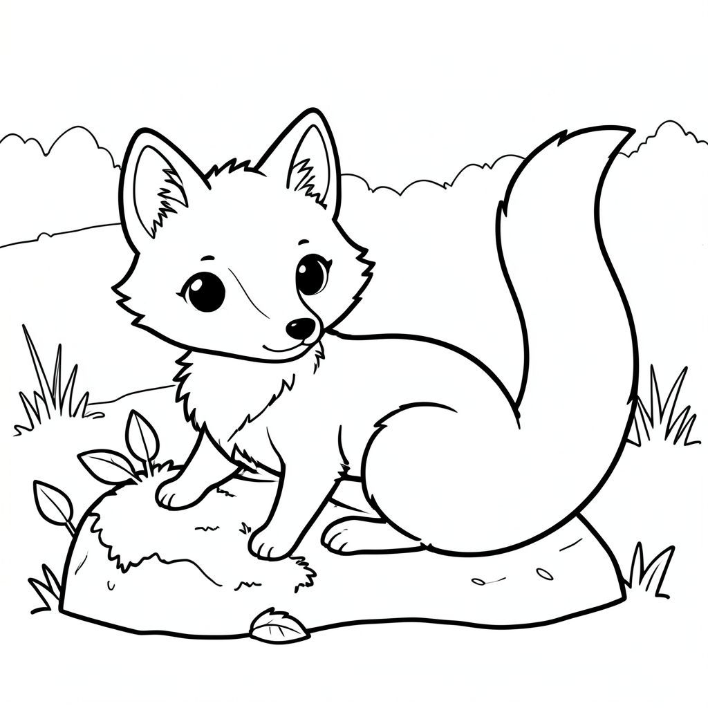Một con cáo nhỏ, lông tơ với một đường cong nhẹ nhàng ở lưng. Khuôn mặt của cáo được xác định bởi đôi mắt to, biểu cảm và chiếc mũi nhỏ, hơi hếch lên. Tai của nó tròn và mềm, đầu có một hình ảnh tinh tế. Một cái đuôi dài, màu trắng duy nhất kéo dài từ phía sau cơ thể của nó, uốn lượn duyên dáng. Con cáo nép mình gần một tảng đá nhỏ, phủ đầy rêu với một vài chiếc lá rải rác. Nền có một trang tô màu đen trắng, mờ, lĩnh vực, phong cách lowbook, nghệ thuật đường nét, đơn sắc, không màu, không bóng, không xám, không điền, nền trắng, chỉ phác thảo, phong cách vector, thiết kế phẳng, 2d, chính xác một đuôi duy nhất, hoàn toàn không tô màu đen, nội thất trắng tinh khiết, không có miếng mực, không văn bản, không từ, không tiêu đề, hoàn toàn không màu, chỉ có lineart đen trắng tinh khiết