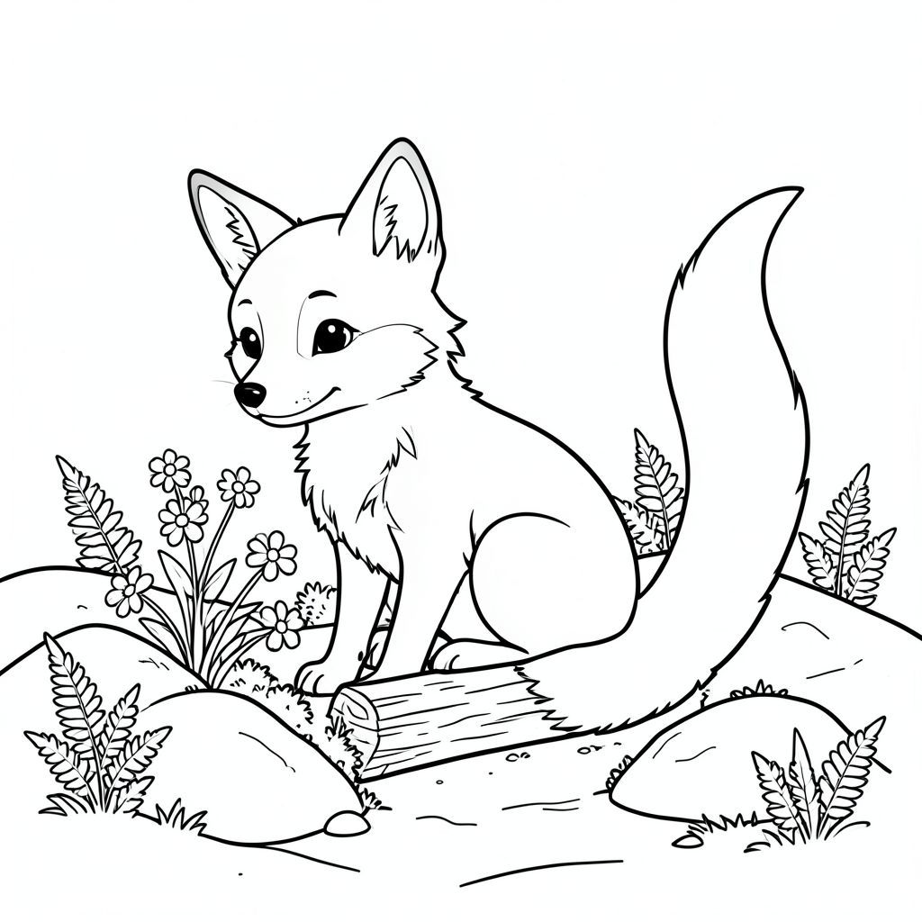 Một con cáo nhỏ ngồi nép mình giữa những tảng đá rêu phong. Nó hơi hướng về bên trái, tai nghiêng về phía trước, quan sát một cụm hoa dại mọc gần đó. Một khúc gỗ nhỏ, nhẵn, nằm dưới bàn chân của nó. Bộ lông của cáo ấm áp, tắt tiếng , với những mảng trắng trên ngực và bụng. Một cái đuôi dài màu trắng duy nhất kéo dài từ lưng, uốn cong duyên dáng. Nền là một vùng đất mềm mại, nhấp nhô, đất ẩm ướt và những cây dương xỉ thu nhỏ, rải rác. Được khuếch tán, tạo điểm nhấn nhẹ nhàng trên đá và lông cáo. Ấn tượng tổng thể là sự mãn nguyện yên tĩnh và một không gian có mái che., tranh tô màu đen trắng, phong cách lowbook, nghệ thuật đường nét, đơn sắc, không màu, không bóng, không xám, không tô màu, nền trắng, chỉ phác thảo, phong cách vector, thiết kế phẳng, 2d, chính xác một đuôi duy nhất, hoàn toàn không tô màu đen, nội thất trắng tinh khiết, không có miếng mực, không văn bản, không từ, không tiêu đề, Hoàn toàn không có màu, chỉ có lineart đen trắng thuần túy