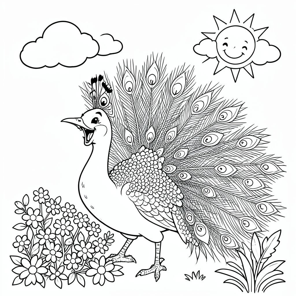 Một con công cười khúc khích với bộ lông lấp lánh khoe chiếc quạt lông của nó, đứng bên cạnh một mảng hoa, với ánh nắng mặt trời vui vẻ và những đám mây kỳ lạ.