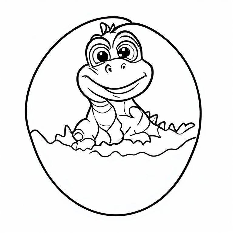 Một con khủng long con với hai mắt chui ra từ một quả trứng, đường viền đơn giản, đường dày, hình dạng lớn, tranh tô màu cho trẻ mới biết đi