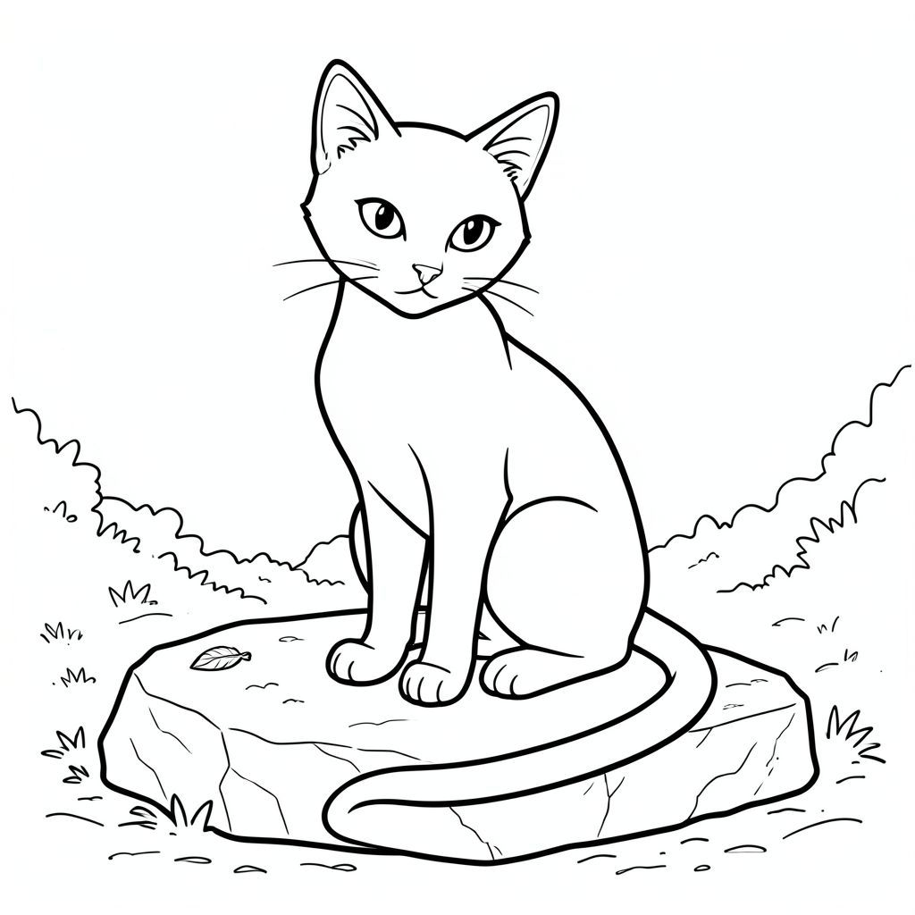 Một con mèo duy nhất, bóng bẩy, ở giữa, ngồi trên một tảng đá rêu phong. Đầu của con mèo là một cái nêm hoàn hảo, hơi nghiêng, một màu sắc, với đôi mắt mãnh liệt. Một đường mỏng kéo dài từ gốc đầu đến đầu đuôi. Đuôi dài và cong duyên dáng, một . Viên đá bên dưới con mèo thô ráp và không đồng đều, với sự thay đổi màu sắc tinh tế. Một chiếc lông mỏng manh duy nhất nằm trên lông mèo. Nền là một nền im lặng, có kết cấu, gợi ý đất ẩm ướt và những tán lá xa xôi. Đường nét cực kỳ chính xác, nhấn mạnh hình dạng của con mèo với những đường nét sắc nét, đậm., tranh tô màu đen trắng, phong cách lowbook, nghệ thuật đường nét, đơn sắc, không màu, không bóng, không xám, không tô màu, nền trắng, đường viền đen đặc, độ tương phản đậm, đường nét sắc nét, chỉ phác thảo, phong cách vector, thiết kế phẳng, 2d, chính xác một đuôi duy nhất, hoàn toàn không tô màu đen, nội thất trắng tinh khiết, Không có miếng mực, không văn bản, không từ, không tiêu đề, hoàn toàn không màu, chỉ có lineart đen trắng thuần túy