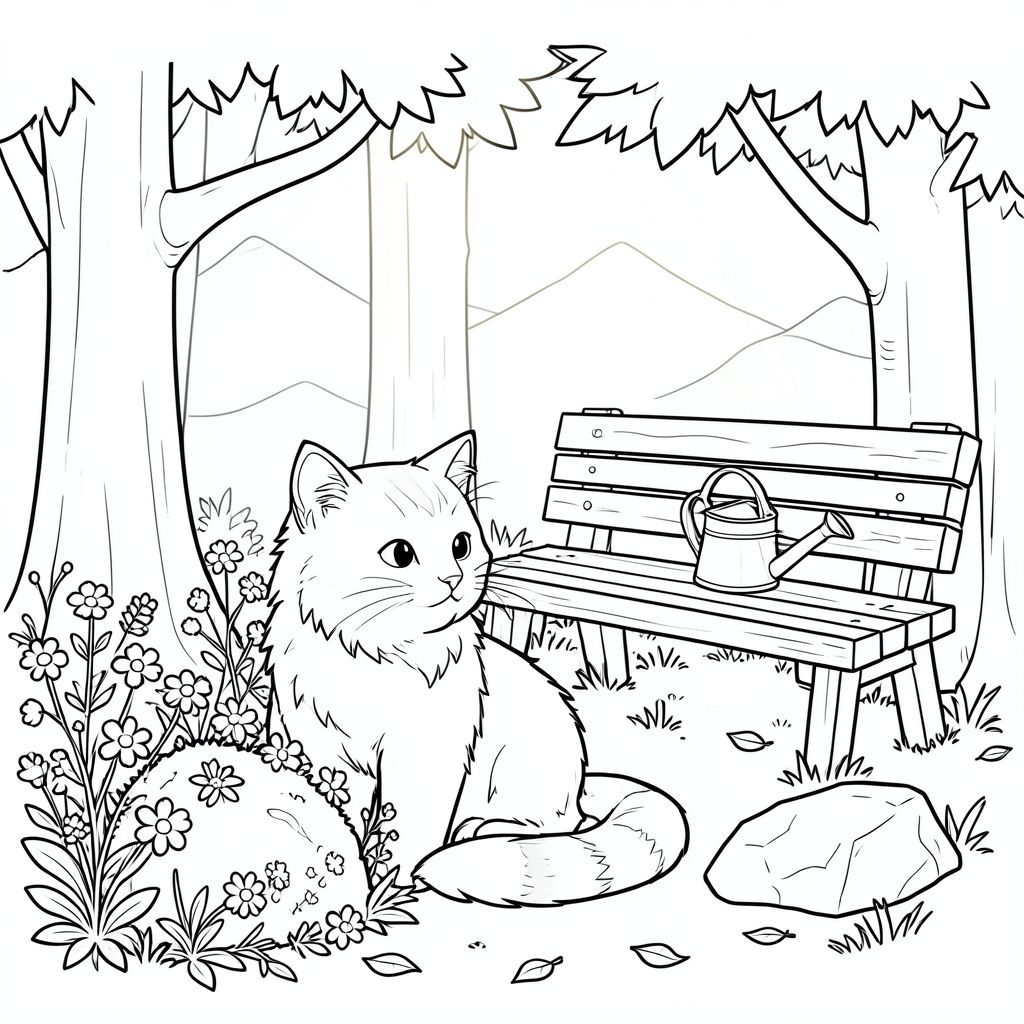 Một con mèo gừng lông tơ ngồi nép mình giữa một cụm cây. Ánh sáng mặt trời lọc xuống qua lá, tạo ra ánh sáng ấm áp. Một tảng đá nhỏ, phủ đầy rêu nằm gần đó, bị che khuất một phần bởi một mớ hoa dại. Một chiếc ghế gỗ mộc mạc được đặt phía sau con mèo một chút, mang đến một vị trí thuận lợi thoải mái. Một bình tưới nhỏ, cổ nằm trên băng ghế, phản ánh . Một vài chiếc lá rải rác thêm vào nền rừng. Đuôi mèo dài, sọc trắng với màu sắc tinh tế. Nền là một ấn tượng mờ mịt, hơi mờ của một dãy núi ở phía xa, được hiển thị bằng các sắc thái của và., trang tô màu đen trắng, phong cách lowbook, nghệ thuật đường nét, đơn sắc, không màu, không bóng, không xám, không tô màu, nền trắng, chỉ phác thảo, phong cách vector, thiết kế phẳng, 2d, chính xác một đuôi duy nhất, hoàn toàn không tô màu đen, nội thất trắng tinh khiết, không có miếng mực vá mực, không văn bản, không từ, không tiêu đề