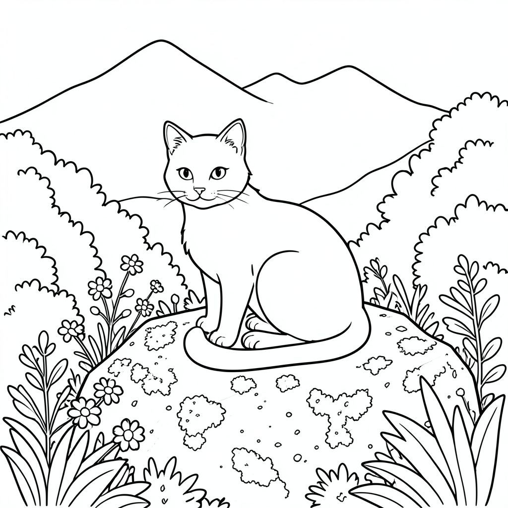 Một con mèo ngồi nép mình trên một tảng đá rêu phong, đuôi hơi cong lại. Đá là một loại đá phong hóa, lốm đốm địa y. Những bụi cây tươi tốt bao quanh tảng đá, che khuất một phần các cạnh của khung cảnh. Một dãy núi mờ mịt ở phía xa mọc lên ở hậu cảnh, các đỉnh núi của nó bị dịu đi bởi một làn sương mù trong khí quyển. Bộ lông của mèo có màu cát ấm áp, và đôi mắt của nó là một , tập trung . Một mảng hoa dại nhỏ mọc ngay bên trái của nó. Bố cục tập trung vào hình dạng của con mèo - thân hình bóng bẩy, đường cong nhẹ nhàng của lưng và nét mặt tinh tế. Nền là sự pha trộn giữa màu xanh lá cây và xanh lam, tạo cảm giác chiều sâu. Ấn tượng tổng thể là một trong những sự mãn nguyện yên tĩnh và sự cô lập yên bình., tranh tô màu đen trắng, phong cách lowbook, nghệ thuật đường nét, đơn sắc, không màu, không bóng, không xám, không điền, nền trắng, chỉ phác thảo, phong cách vector, thiết kế phẳng, 2d, chính xác một đuôi duy nhất, hoàn toàn không tô màu đen, nội thất trắng tinh khiết, không có miếng mực, không văn bản, không từ, không tiêu đề, Hoàn toàn không có màu, chỉ có lineart đen trắng thuần túy
