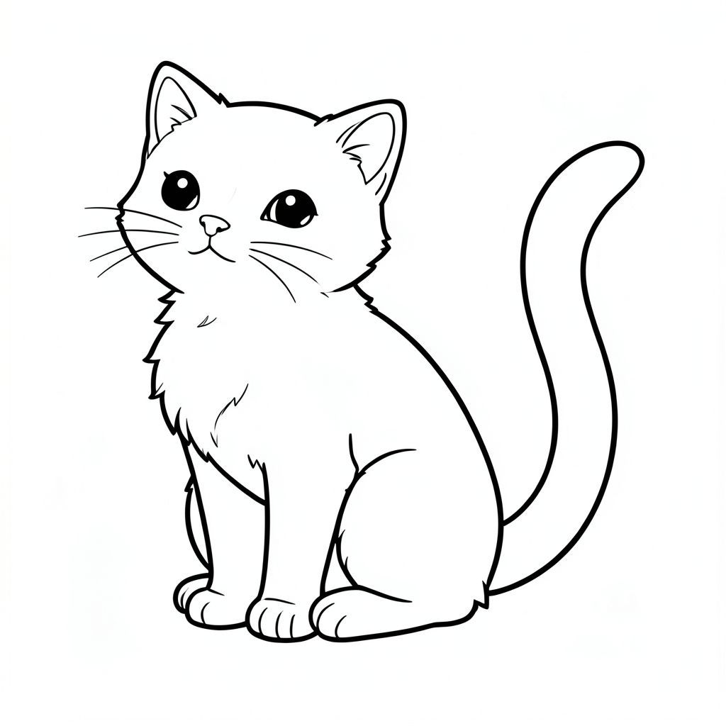 Một con mèo nhỏ, lông tơ ngồi thẳng, bàn chân nhét gọn gàng dưới ngực. Bộ lông của nó mềm, với bóng râm tinh tế để tạo chiều sâu. Một đường duy nhất, dày, kéo dài từ lưng mèo, tạo thành một cái đuôi. Đuôi dài và hơi cong, có đầu thoai thoải. Nền là một không gian trắng đơn giản, sạch sẽ, không có bất kỳ chi tiết nào., tranh tô màu đen trắng, phong cách lowbook, nghệ thuật đường nét, đơn sắc, không màu, không bóng, không xám, không tô màu, nền trắng, chỉ phác thảo, phong cách vector, thiết kế phẳng, 2d, chính xác một đuôi duy nhất, hoàn toàn không tô màu đen, nội thất trắng tinh khiết, không có miếng mực, không có văn bản, không có từ, Không có tiêu đề