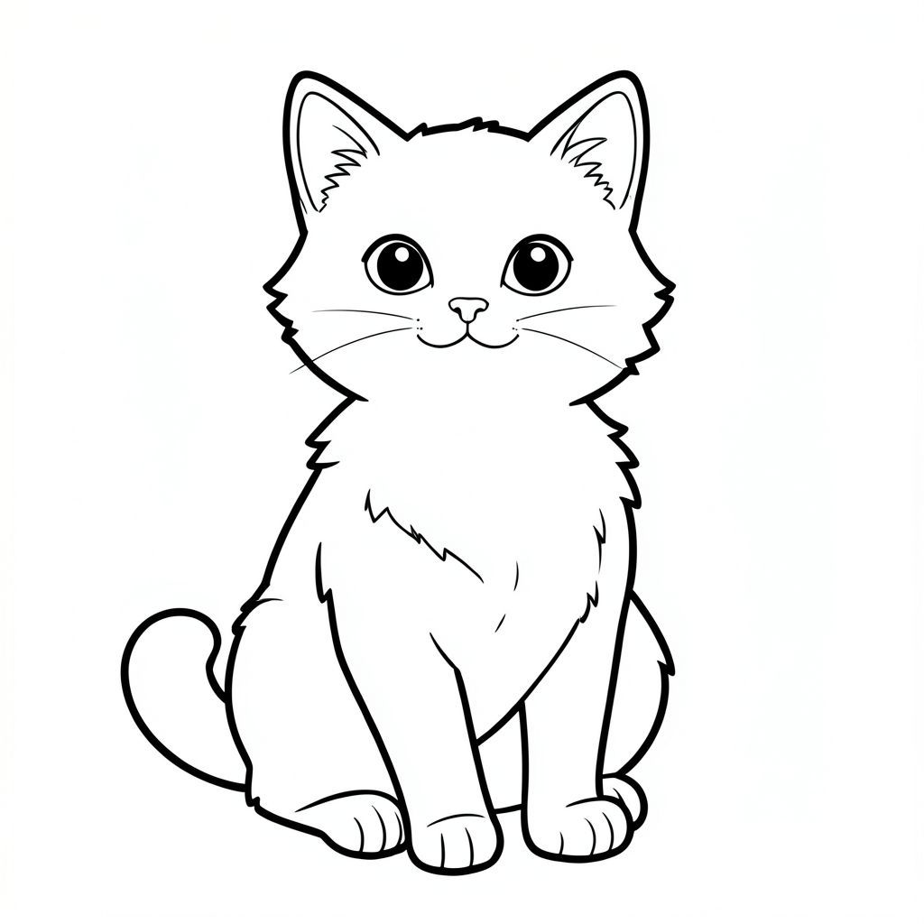 Một con mèo nhỏ, lông tơ ngồi thẳng, nhìn thẳng về phía trước với cái miệng há hốc mồm nhẹ nhàng. Khuôn mặt của con mèo được xác định nhẹ nhàng, với đôi mắt to, biểu cảm. Một chiếc đuôi duy nhất, thanh lịch uốn cong duyên dáng từ phía sau gáy của nó. Bộ lông của mèo mềm mại, tạo ra một sự tinh tế . Nền là một trang tô màu đen trắng đơn giản, phong cách lowbook, nghệ thuật đường nét, đơn sắc, không màu, không bóng, không xám, không điền, nền trắng, chỉ phác thảo, phong cách vector, thiết kế phẳng, 2d, chính xác một đuôi duy nhất, hoàn toàn không tô màu đen, nội thất trắng tinh khiết, không có miếng mực, không văn bản, không từ, không tiêu đề, hoàn toàn không có màu, Chỉ Pure Black and White Linarts