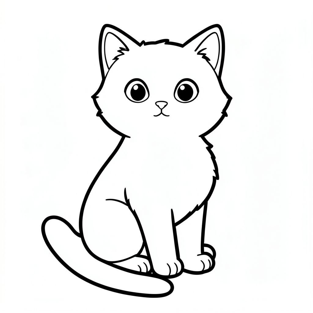 Một con mèo nhỏ, lông tơ ngồi thẳng, nhìn về phía trước một chút. Khuôn mặt của nó có một đường cong nhẹ nhàng màu trắng, với đôi mắt to, biểu cảm. Một đường duy nhất kéo dài từ dưới đầu của nó, tạo thành một cái đuôi. Cơ thể mèo là một hình dạng đơn giản, hơi góc cạnh, chứa đầy màu trắng tinh khiết., tranh tô màu đen trắng, phong cách lowbook, nghệ thuật đường nét, đơn sắc, không màu, không đổ bóng, không xám, không tô màu, nền trắng, chỉ phác thảo, phong cách vector, thiết kế phẳng, 2d, chính xác một cái đuôi duy nhất, hoàn toàn không tô màu đen, nội thất trắng tinh khiết, không có miếng mực, không có văn bản, không có từ, Không có tiêu đề, hoàn toàn không có màu, chỉ có lineart đen trắng thuần túy