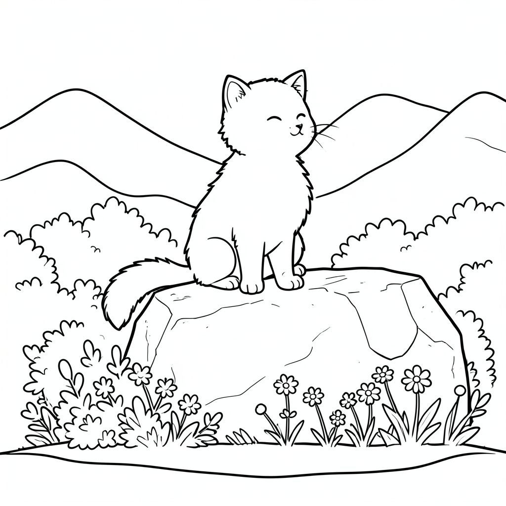 Một con mèo nhỏ, lông tơ ngồi trên một tảng đá bị phong hóa. Bộ lông của nó có màu trắng kem, và đuôi của nó uốn cong nhẹ nhàng xuống dưới. Đá bị che khuất một phần bởi một lớp bụi cây dày, tạo ra một phông nền mềm mại, có kết cấu. Xa hơn, những ngọn núi tròn, xa xôi mọc lên trong sắc thái, im lặng, tạo ra một đường chân trời mờ mịt. Một rải rác những bông hoa dại nhỏ mọc xung quanh đáy đá, tạo thêm một chút ấm áp. Bàn chân của mèo được đặt ở vị trí tinh tế, hơi nghiêng về phía đá. Khung cảnh được đóng khung bởi một đường ngang đơn giản của một , cát . Ấn tượng tổng thể là một trong những sự yên tĩnh yên bình., tranh tô màu đen trắng, phong cách lowbook, nghệ thuật đường nét, đơn sắc, không màu, không bóng, không xám, không điền, nền trắng, chỉ phác thảo, phong cách vector, thiết kế phẳng, 2d, chính xác một đuôi duy nhất, hoàn toàn không tô màu đen, nội thất trắng tinh khiết, không có miếng mực, không có văn bản, không từ, không tiêu đề, hoàn toàn không có màu, Chỉ Pure Black and White Linarts