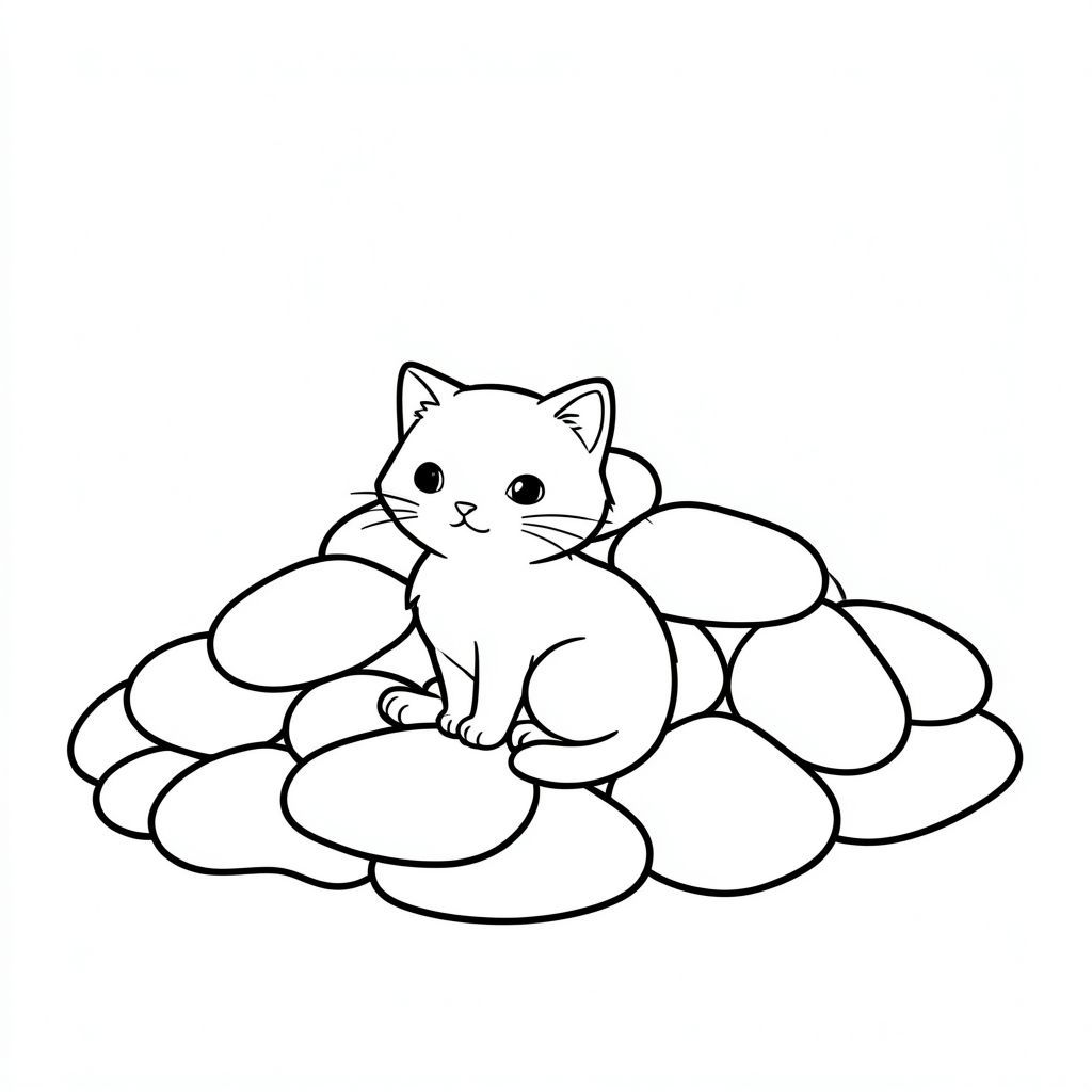 Một con mèo nhỏ ngồi nép mình giữa một đống đá nhẵn. Đống đá hơi nghiêng, tạo ra một đường cong tinh tế ở hậu cảnh., trang màu, nghệ thuật đường nét, nền trắng